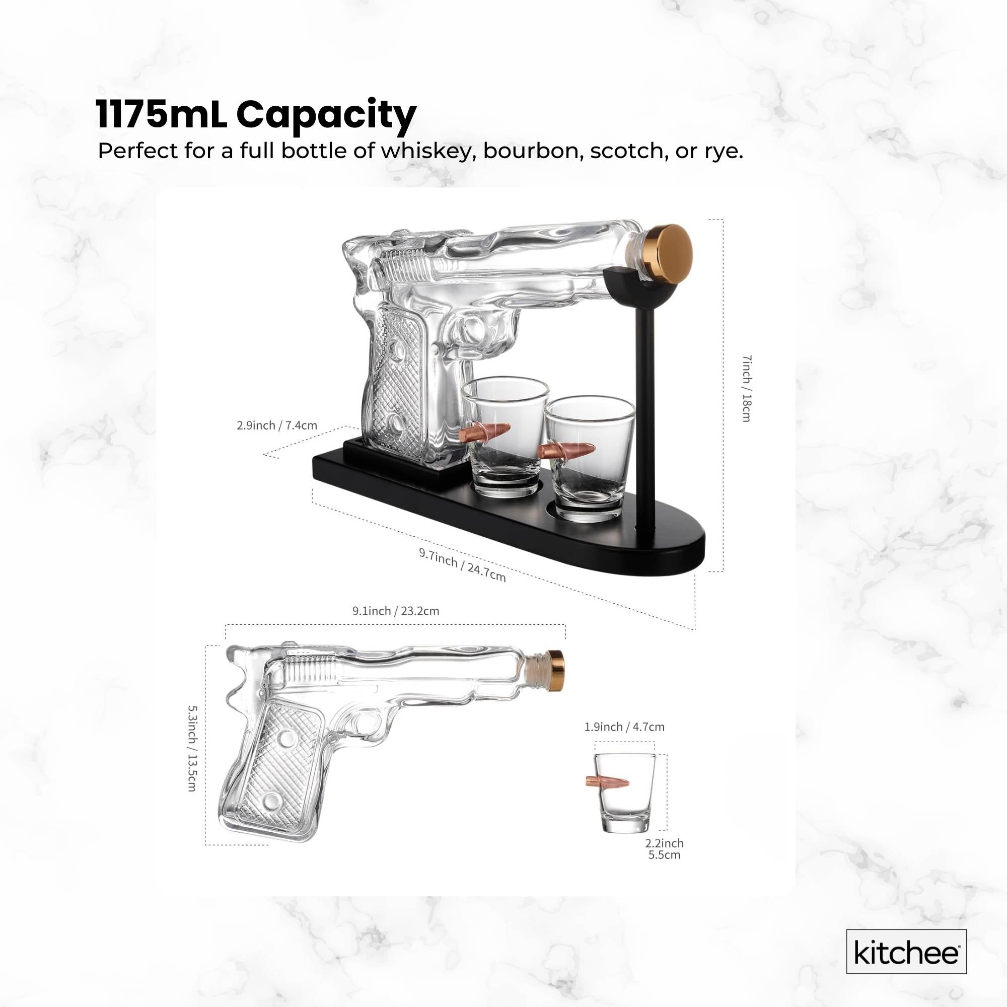 Take your home bar to the next level or surprise a whiskey enthusiast with our striking glass gun-shaped whiskey decanter set. This unique and artistic piece is not just for storing and serving your finest spirits—it’s a conversation starter, blending bold design with practical functionality. Featuring a 1175ml glass decanter shaped like a detailed pistol and paired with two bullet-inspired shot glasses, this set is presented on an elegant wooden stand.