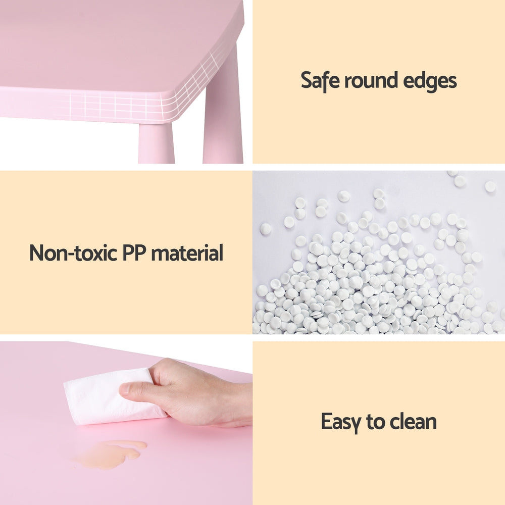Make playtime or study time more enjoyable with the Keezi Kids Table and Chairs Set. Designed in fun blue and pink colours, this set includes one table and two matching chairs, perfect for children aged three years and above. Made from non-toxic PP material, the table and chairs are both durable and practical, ensuring long-lasting use. The smooth edges ensure safety, while the sturdy construction provides stability for various activities. Easy to assemble and simple to maintain, this set is the ideal addition to any child's room or play area.