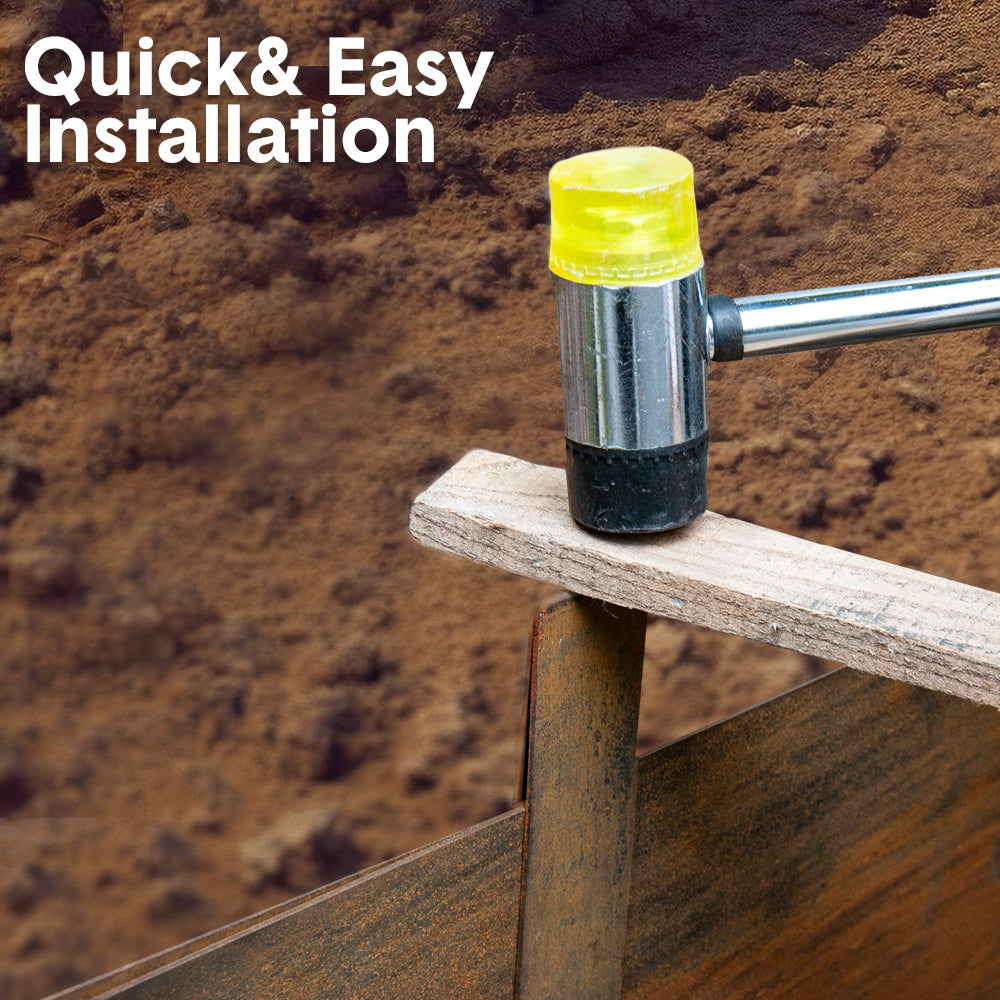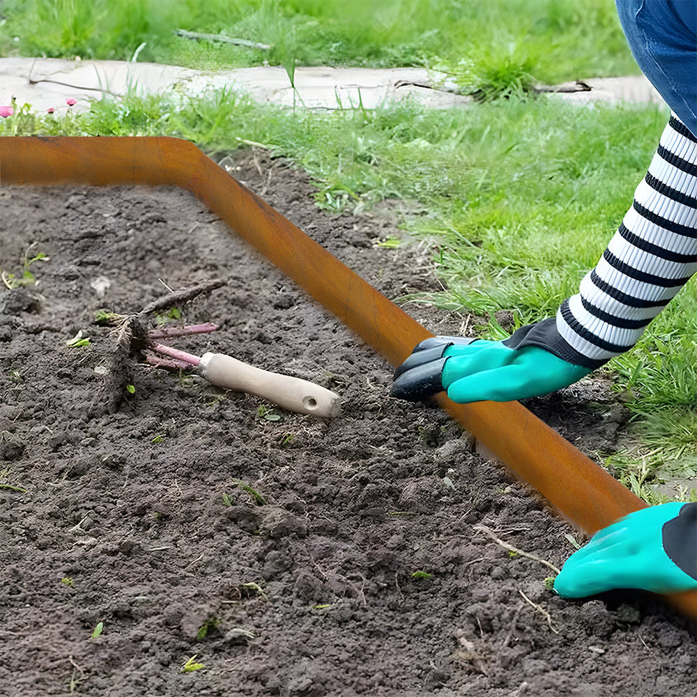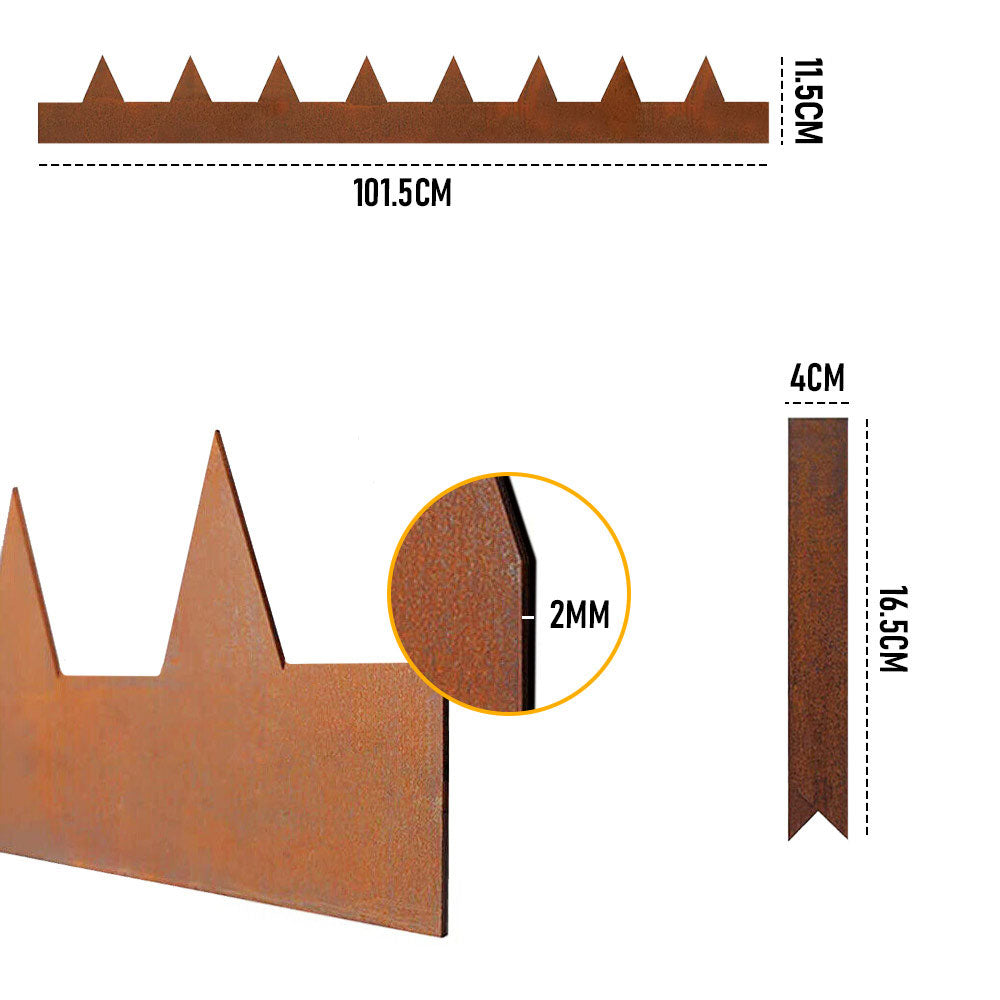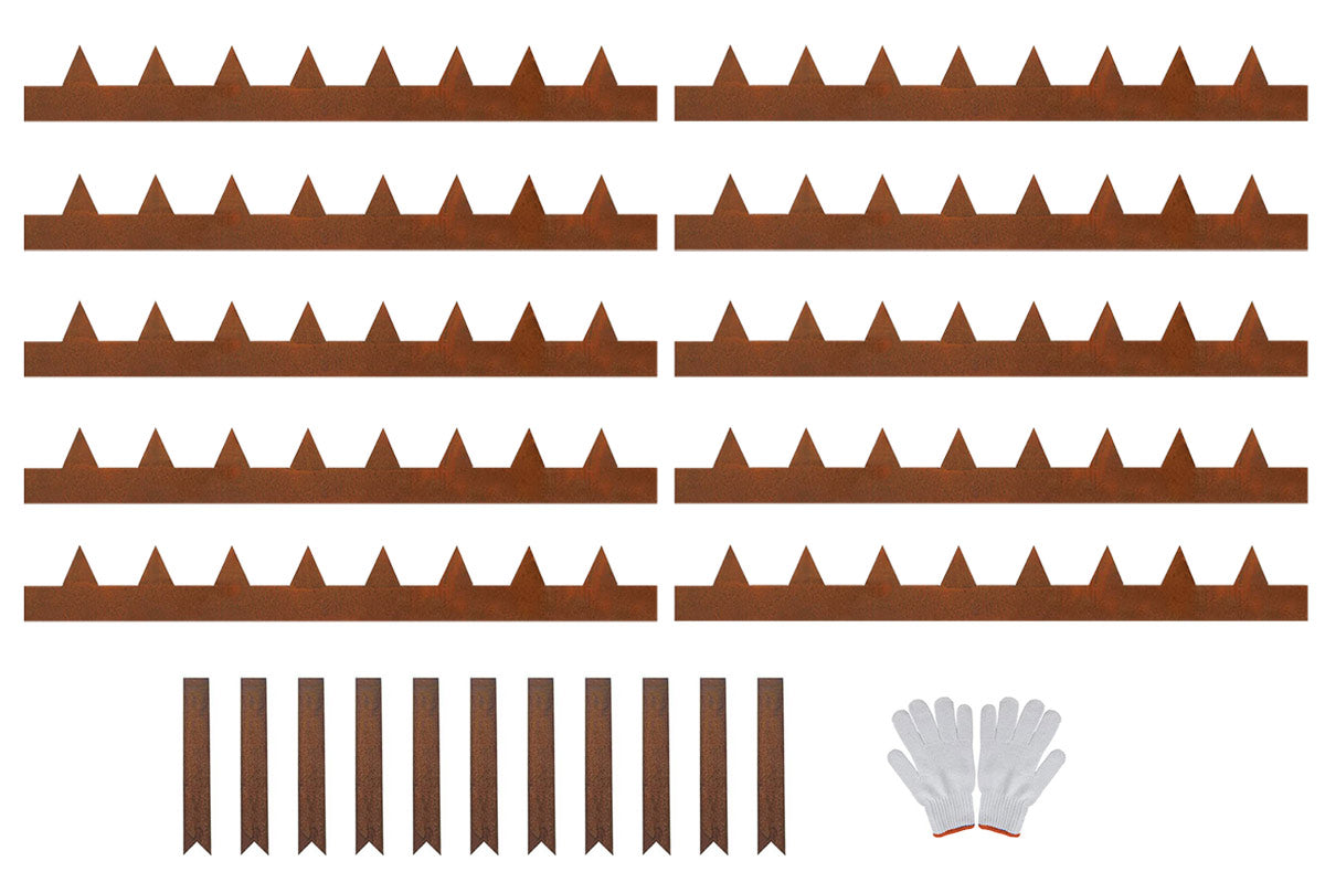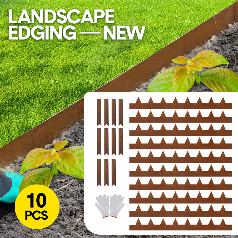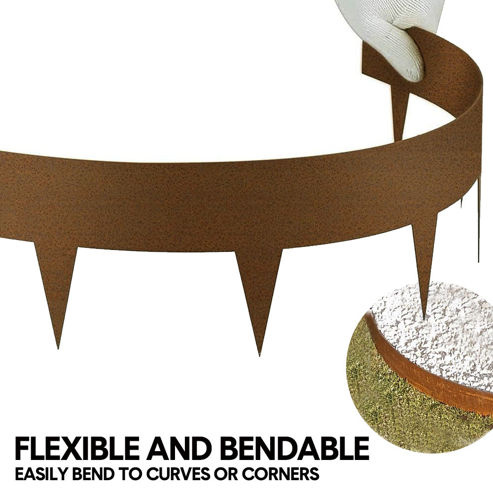 Introducing our 10-pack Steel Landscape Lawn Edging,durable and pre-rusted finish. Featuring with 6cm above the ground, 6.5cm spike for easy hammer in and bendable design, it's easy to insert into the ground and reshape.The package includes 11 clips and bonus gloves.Suitable for both commercial and residential use.