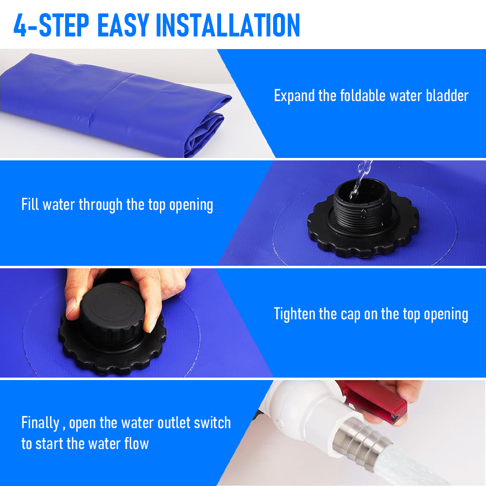 Crafted from high-quality PVC material, this water bladder is designed for convenience, durability, and easy use in emergency situations. Equipped with a built-in faucet and easy-access pull rings, it simplifies water retrieval and usage. It can be easily folded and rolled up for compact storage, maximizing space efficiency.
