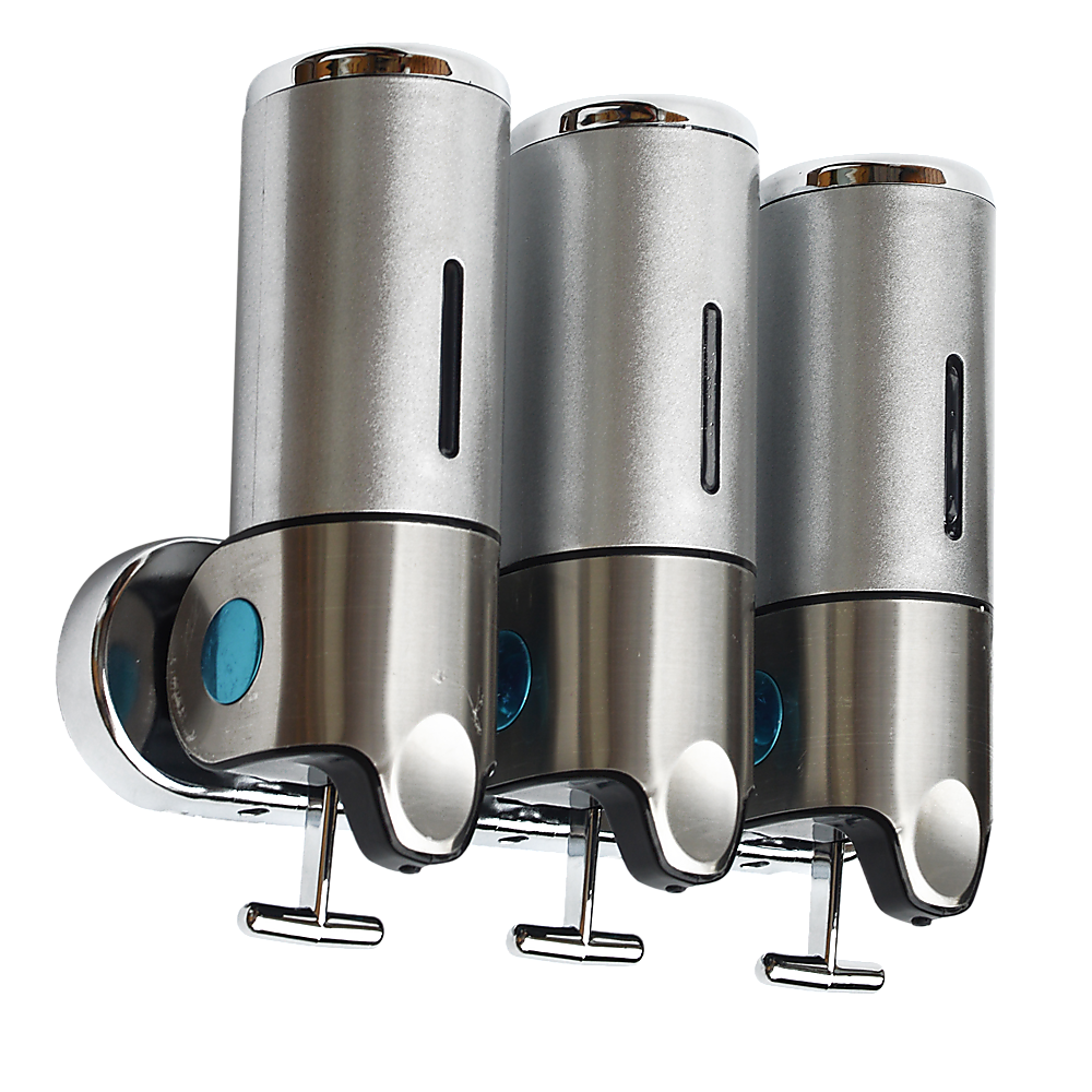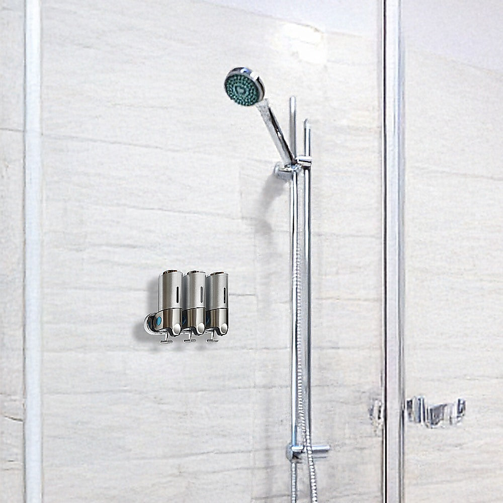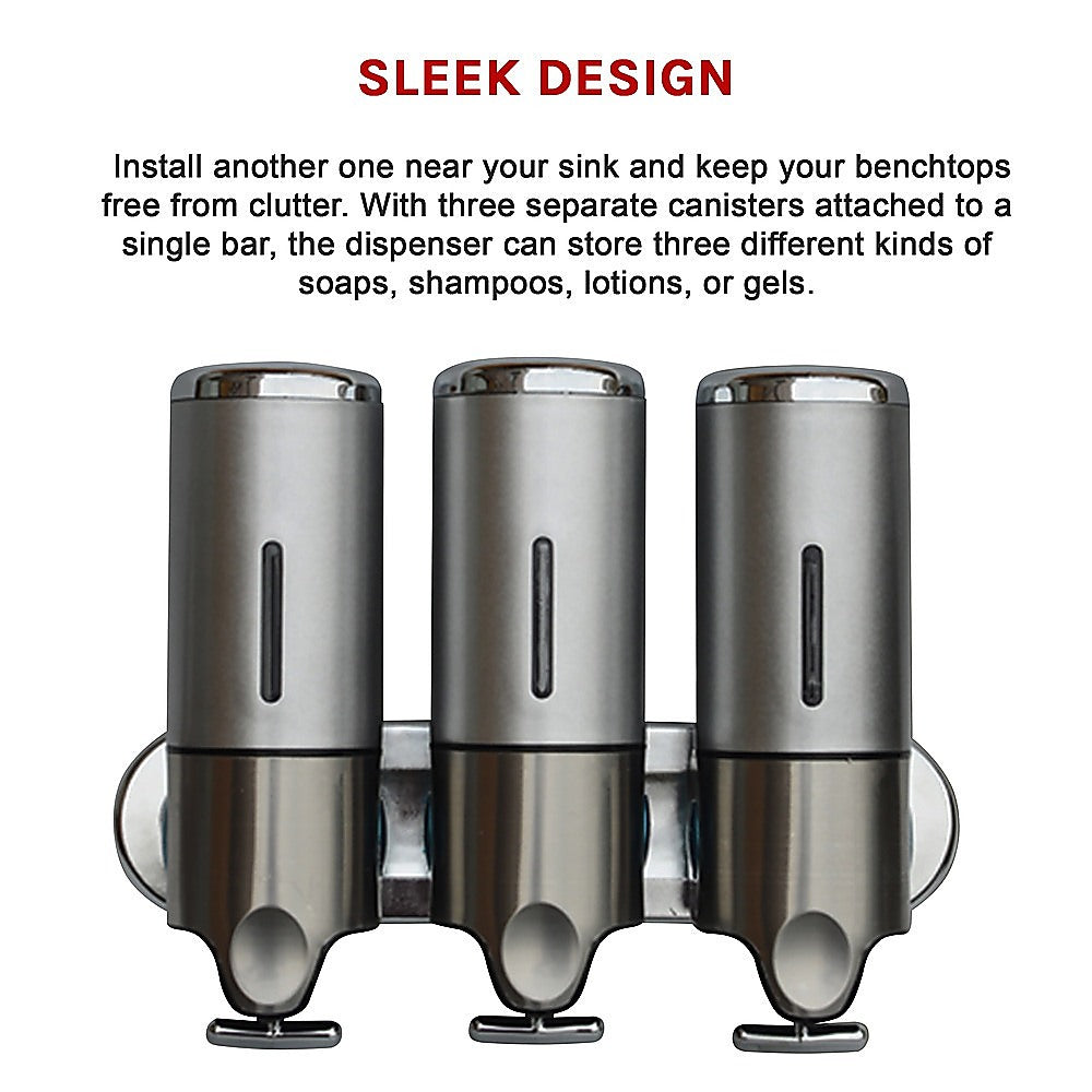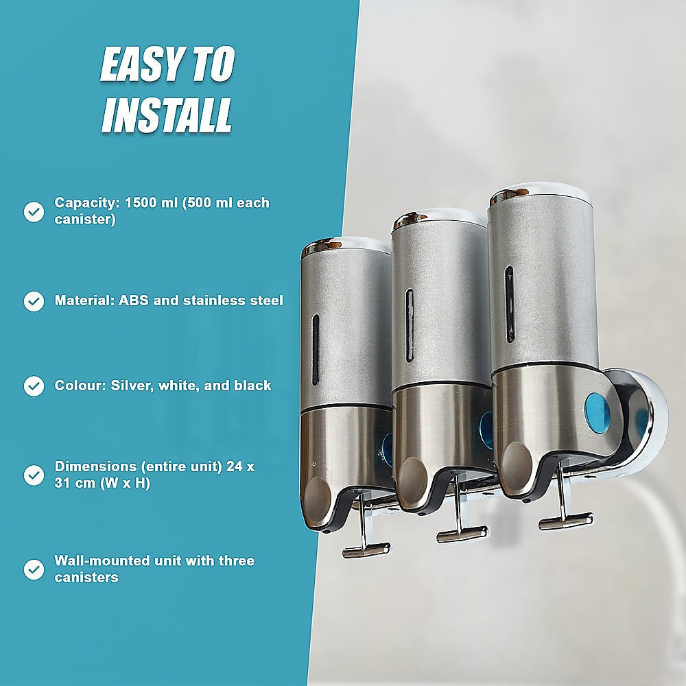 With its sleek, ergonomic design, this shower soap dispenser looks great in your shower. Install another one near your sink and keep your benchtops free from clutter. With three separate canisters attached to a single bar, the dispenser can store three different kinds of soaps, shampoos, lotions, or gels.