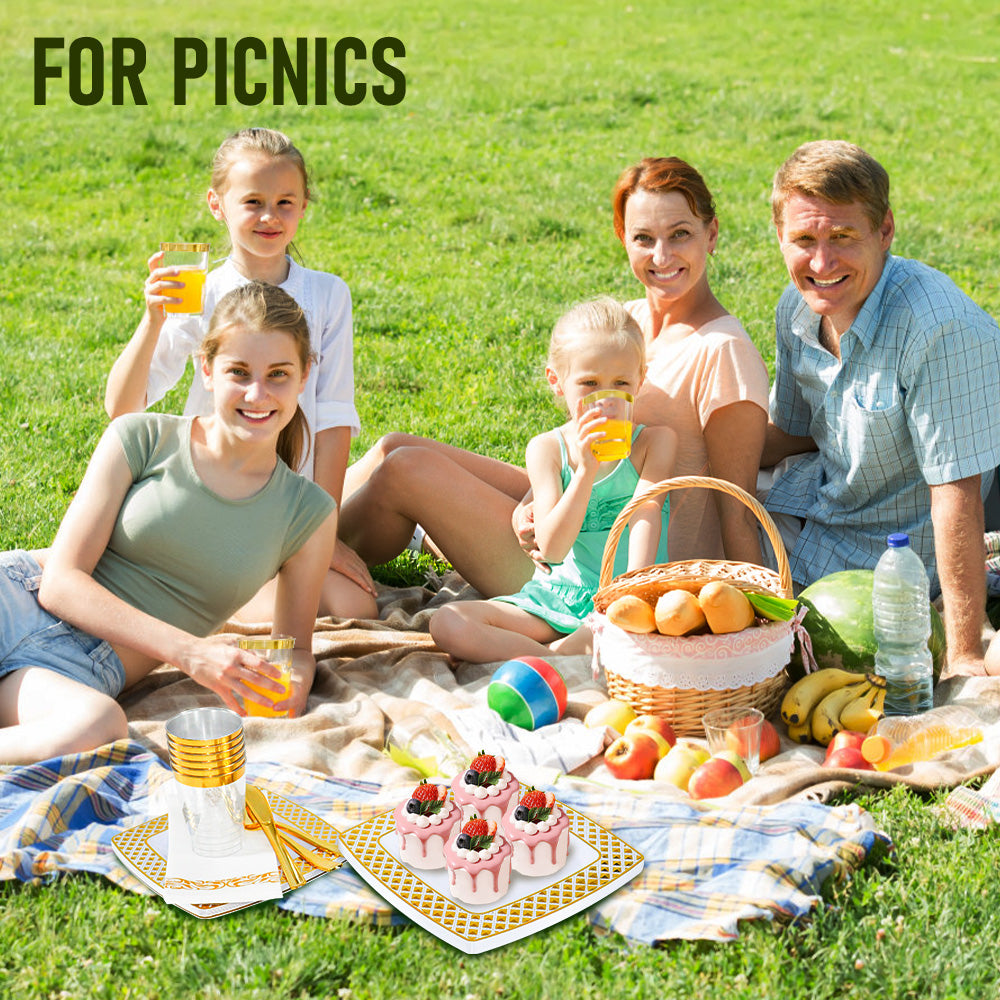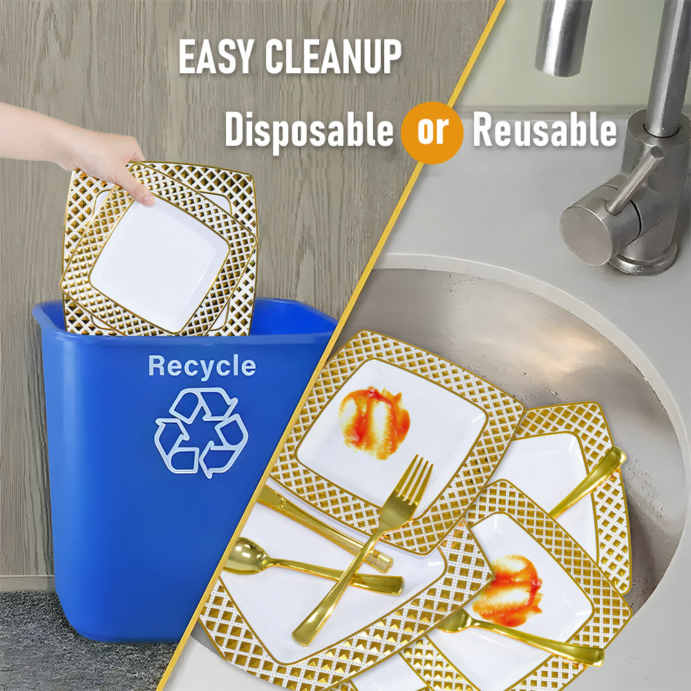 Crafted from food-grade plastic, this set is completely non-toxic, BPA-free, and recyclable, guaranteeing safety use.It includes square plates, dessert plates, forks, knives, spoons, cups, and napkins, eliminating the need for additional purchases. Enjoy the convenience of disposable tableware for quick cleanup.