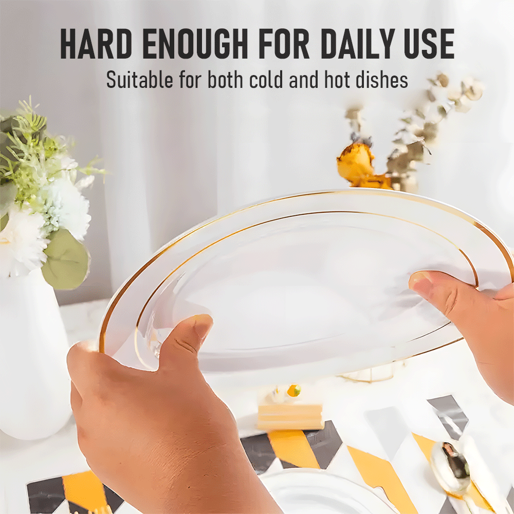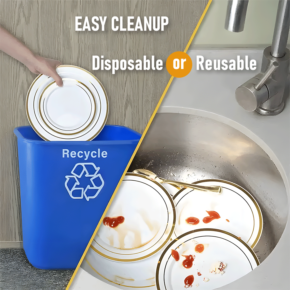 Crafted from food-grade plastic, this set is completely non-toxic, BPA-free, and recyclable, guaranteeing safety use.It includes gold plates, dessert plates, forks, knives, spoons, cups, and napkins, eliminating the need for additional purchases. Enjoy the convenience of disposable tableware for quick cleanup.