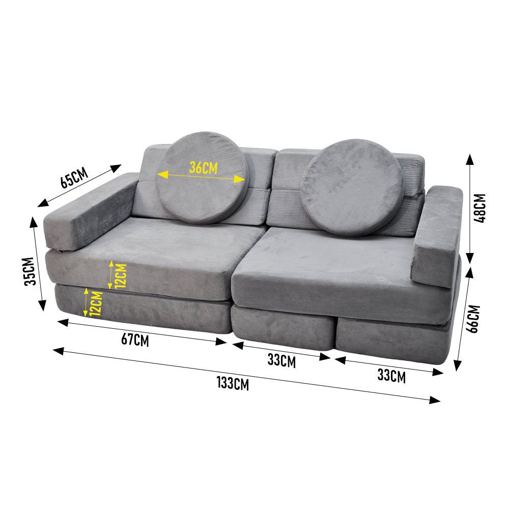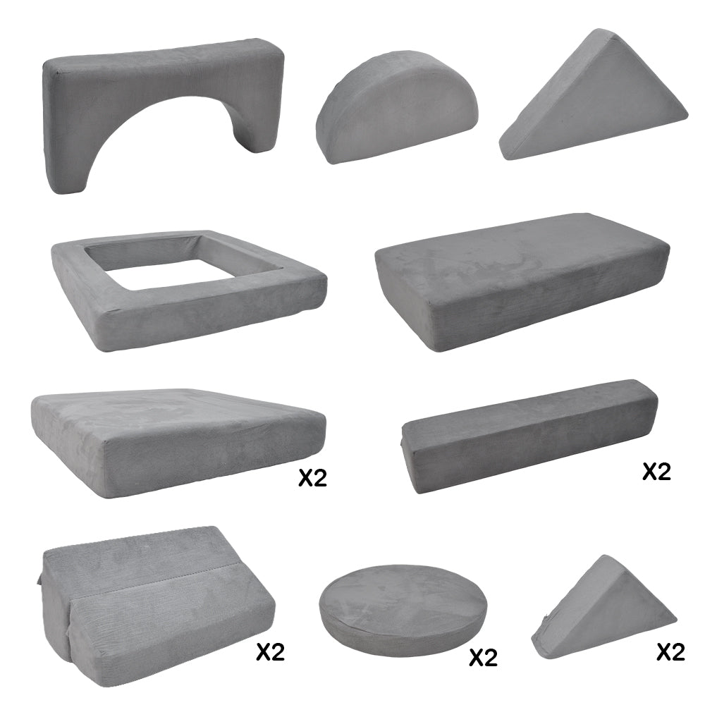 This kid sofa playset is made of high-density 25D sponge and a washable faux suede cover, it's both durable and comfy without deformation. Removable zippered covers make cleaning easy, while the various shaped blocks allows kids to climb, jump, or rest safely. It brings endless fun and keeps your kids active indoors.