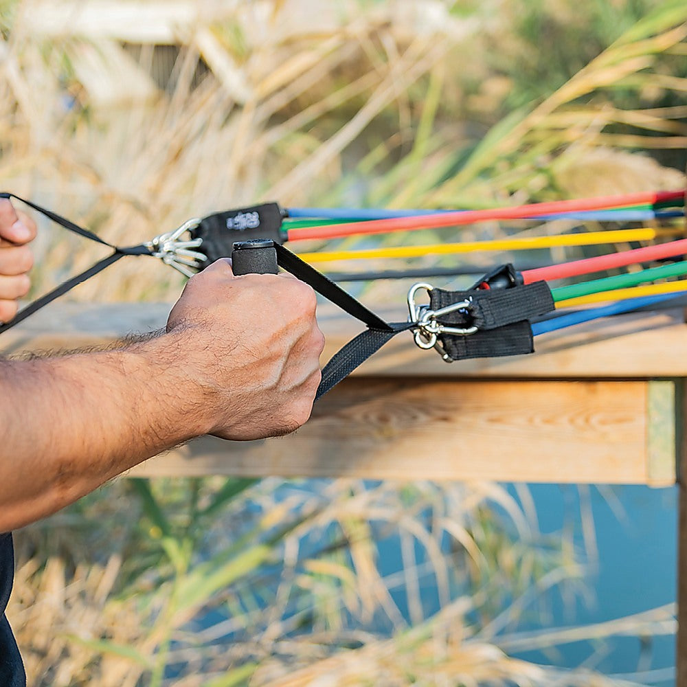 For an exceptional, all-around alternative to weight training, consider our 19-Piece Resistance Exercise Bands Set. A nearly endless variety of exercises is possible, exercises which will work every major muscle group of the body. They're great for athletes, injury rehabilitation, or just individuals wanting to get toned and fit. And with a total resistance of 134 kg, there's no end to what you can do.