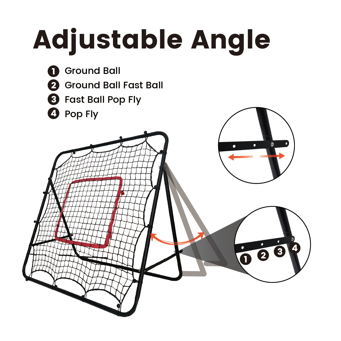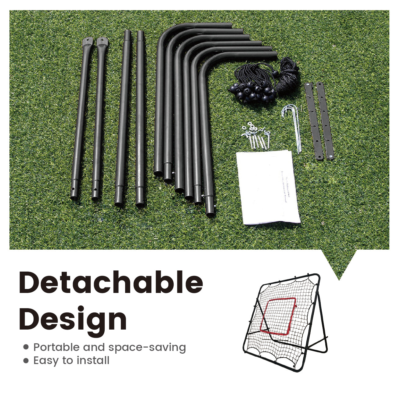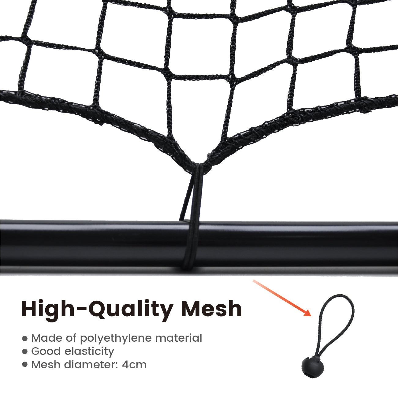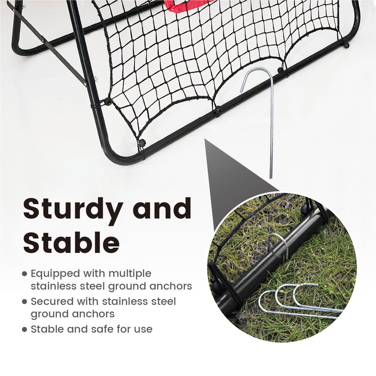 Built with a sturdy iron frame, this rebounder delivers long-lasting stability. The high-elasticity PE net ensures consistent training impacts and resistance to wear and tear. The angle of the rebound panel is adjustable for versatile training, while included ground hooks provide extra stability. All necessary accessories included for quick assembly.