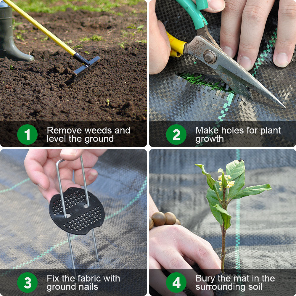 This weed control fabric is made from tightly woven, high-strength PE that's durable, breathable, highly permeable, and tear-resistant. It can be easily cut to fit any area or shape, and included 120 ground nails keep it firmly in place even on windy days. Perfect for a variety of agricultural and gardening applications.