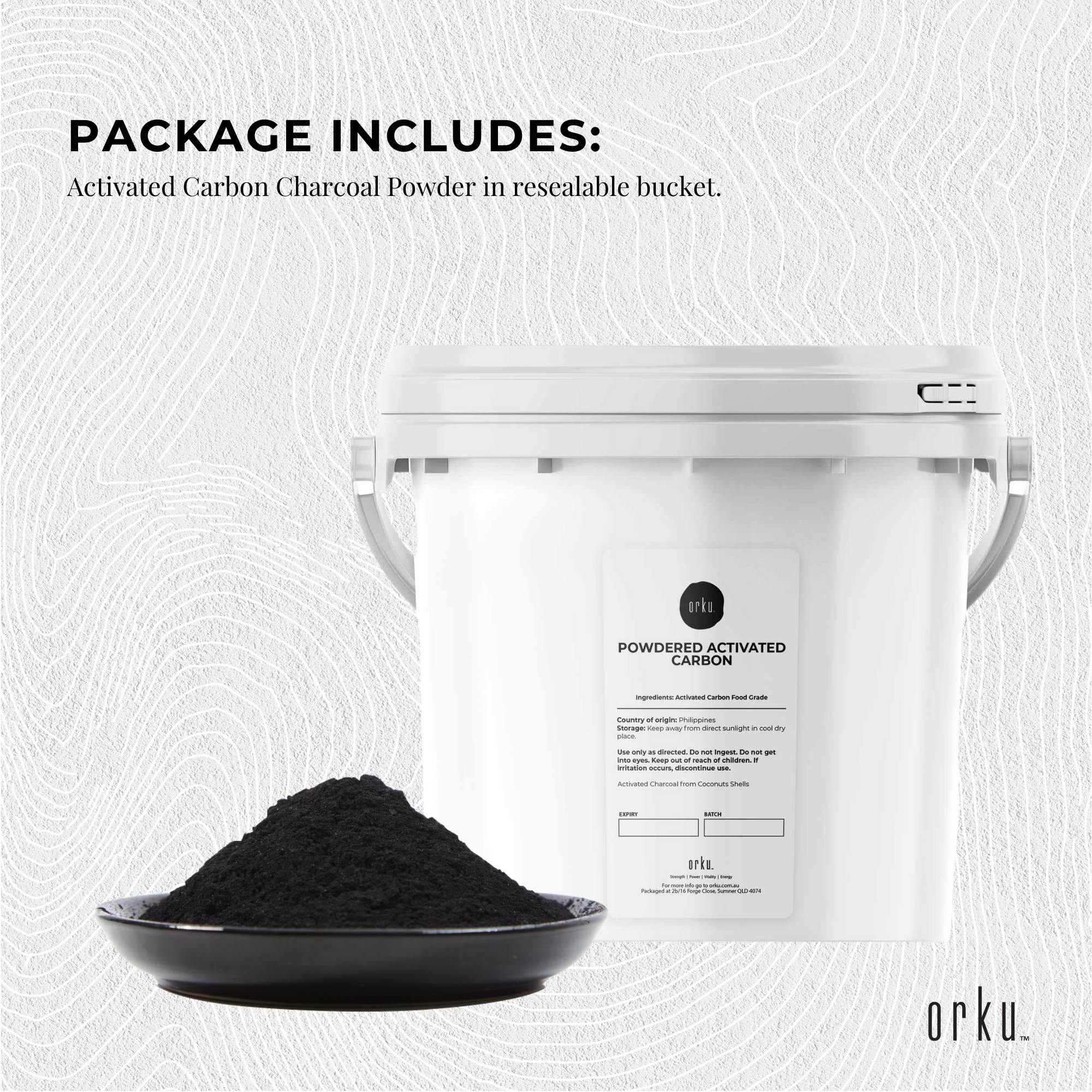 Activated Carbon Charcoal Powder in resealable bucket.