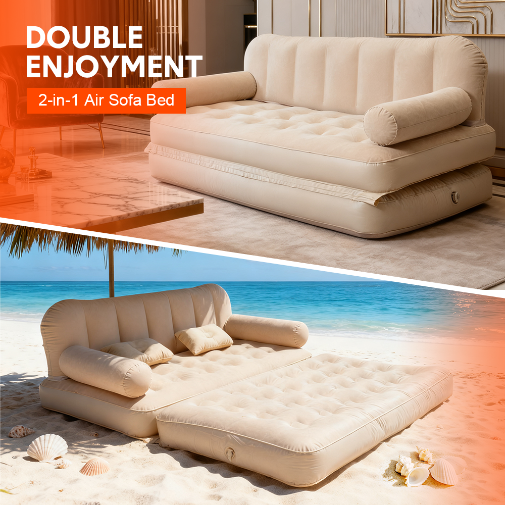 Enjoy the flexibility of a sofa and bed in one set. Our inflatable sofa bed can transform easily from a comfortable couch to a spacious air bed, offering versatile comfort for rest, lounging, or accommodating guests. With its large double size and quick inflation, it's perfect for both home use and outdoor adventures.