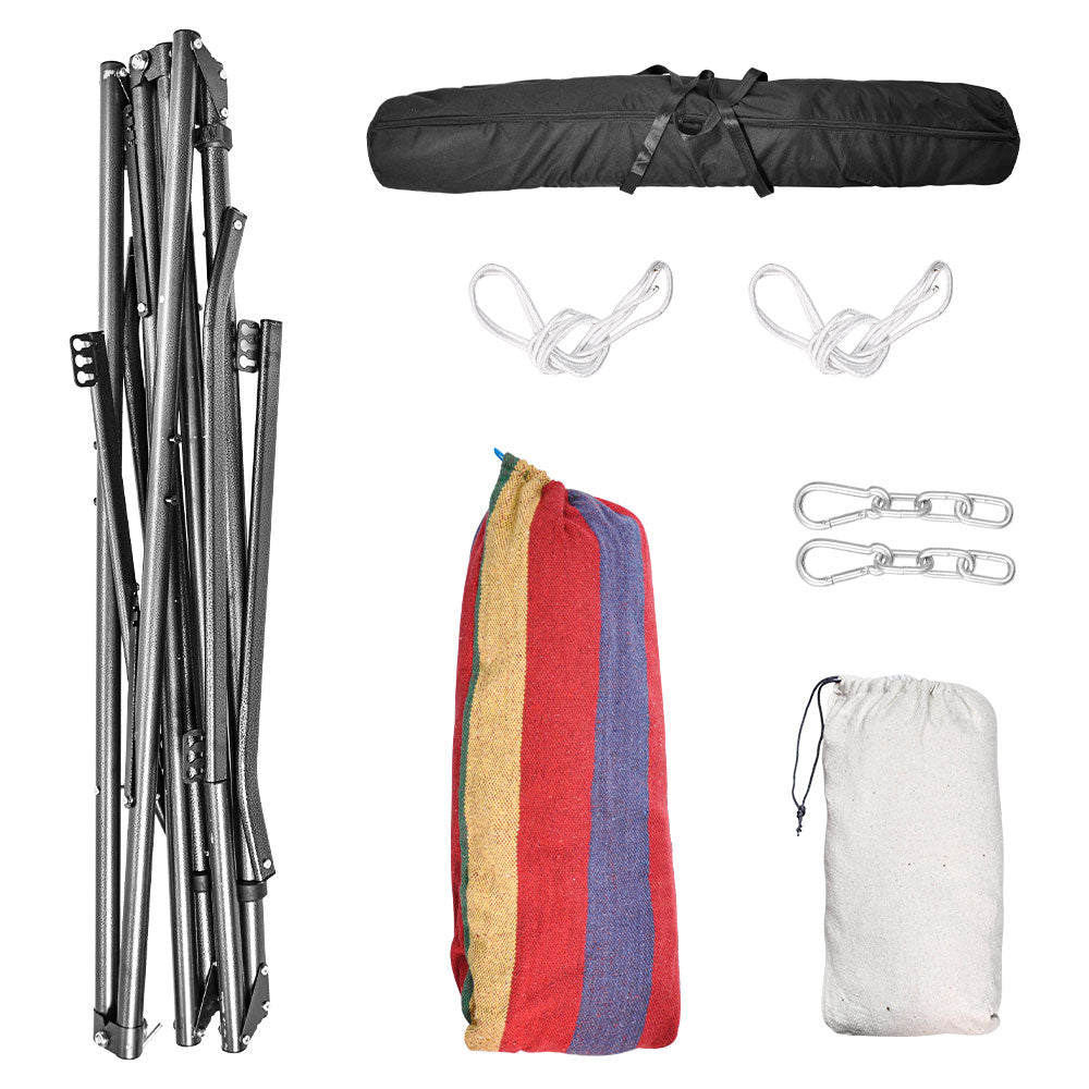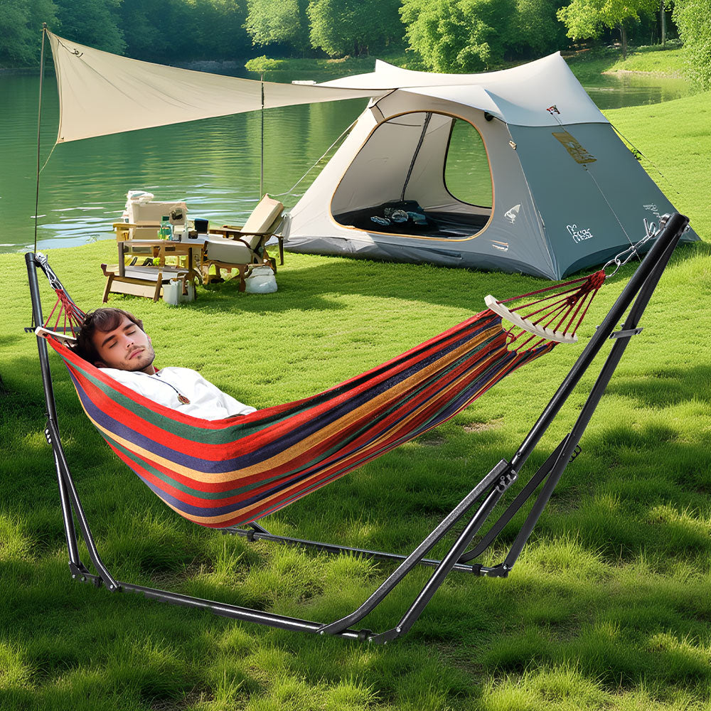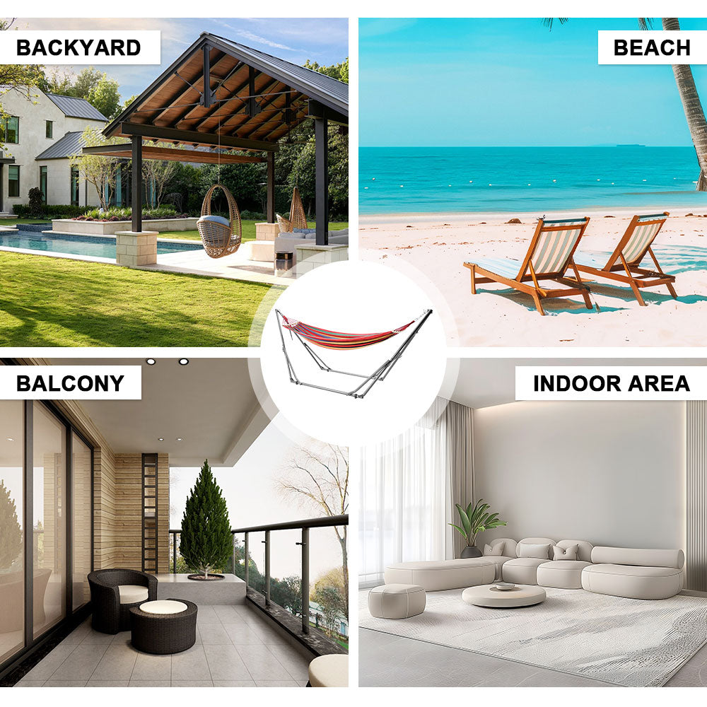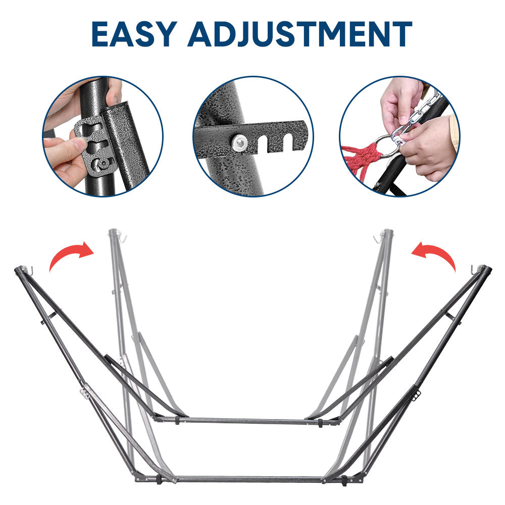 Built with a heavy-duty galvanized steel frame and high-strength hooks, this hammock supports up to 200kg safely. Adjustable frame let you customize width, height and tightness, while anti-slip feet keep the stand stable on any surface. Vibrant, durable fabric ensures long-lasting comfort. Easy to assemble without complicated tools.
