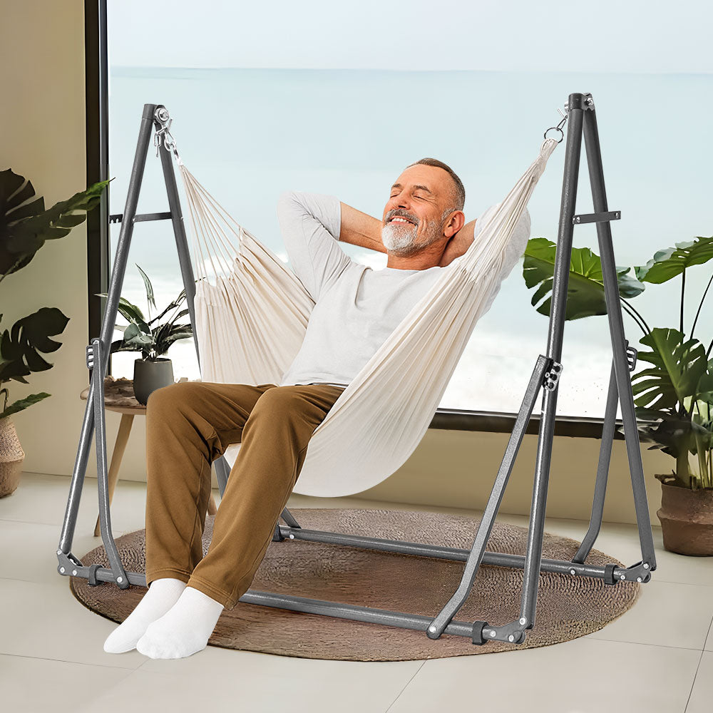 This 2-in-1 swing hammock set is designed for both lounging and sitting, offering a cozy retreat for reading, napping, or enjoying the fresh air anytime, anywhere. Smooth swinging motion creates a gentle and comfort experience, while the compact, foldable structure makes it easy to carry for backyard, garden, beach, or camping adventures.
