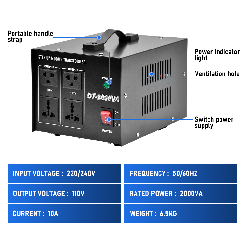 With its clear input/output configuration, this transformer provides two 110V output sockets that support most international plug types. It includes built-in fuse protection, a power indicator light, and a convenient on/off switch to prevent electrical hazards. Efficient side ventilation ensures quick heat dissipation, while the sturdy handle makes transport easy.