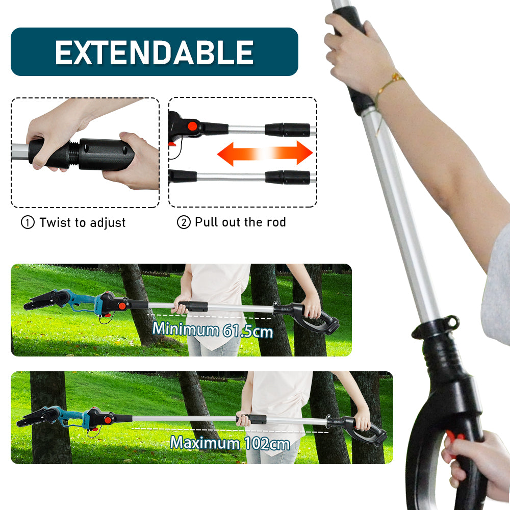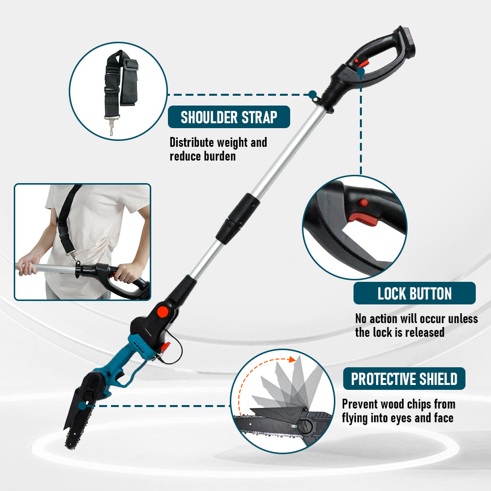 The Cordless Pruning Saw features a 1.8m telescopic shaft and rust-resistant 8-inch blade for easy high-branch trimming. Its ergonomic, anti-slip handle ensures one-handed operation. 750W Brushless motor delivers consistent performance, while safety switches provide reliable and efficient cutting.