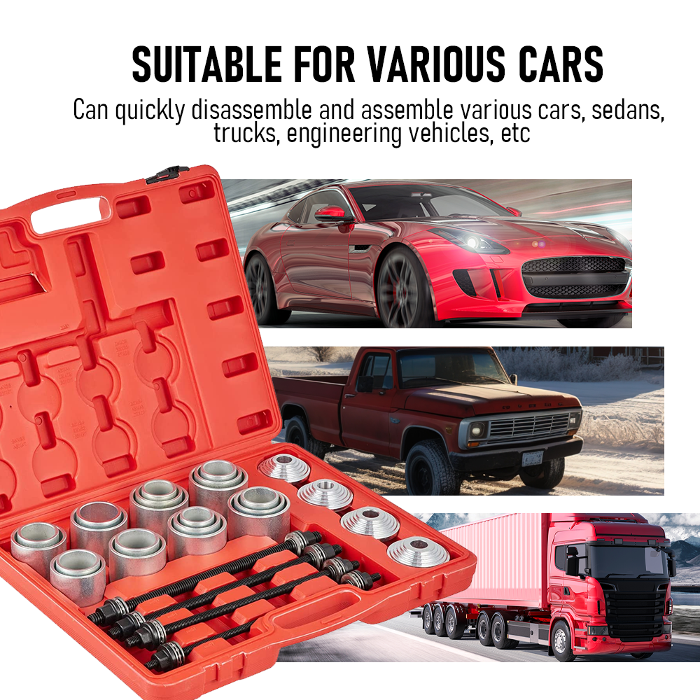 The 30-Piece Universal Press Pull Sleeve Kit Set is specifically designed for the removal and installation of various types of bearings, bushes, and seals, including silent bearings, hydraulic bearings, ball bearings, shaft seals, and rubber bearings, making it an essential tool for automotive repairs and maintenance.