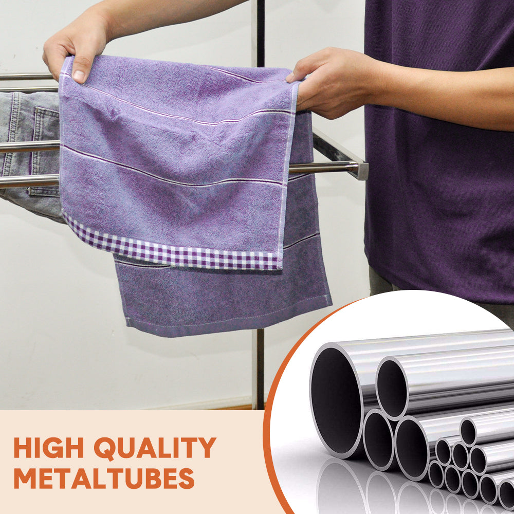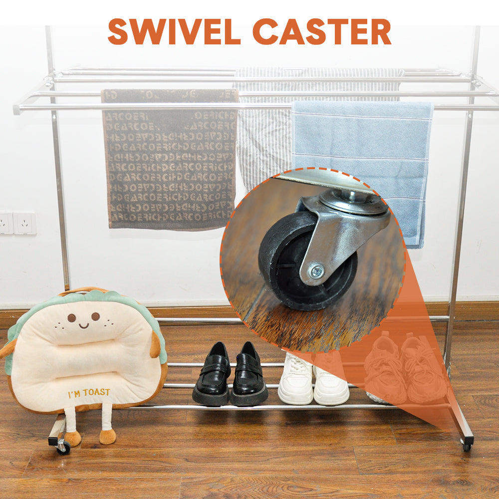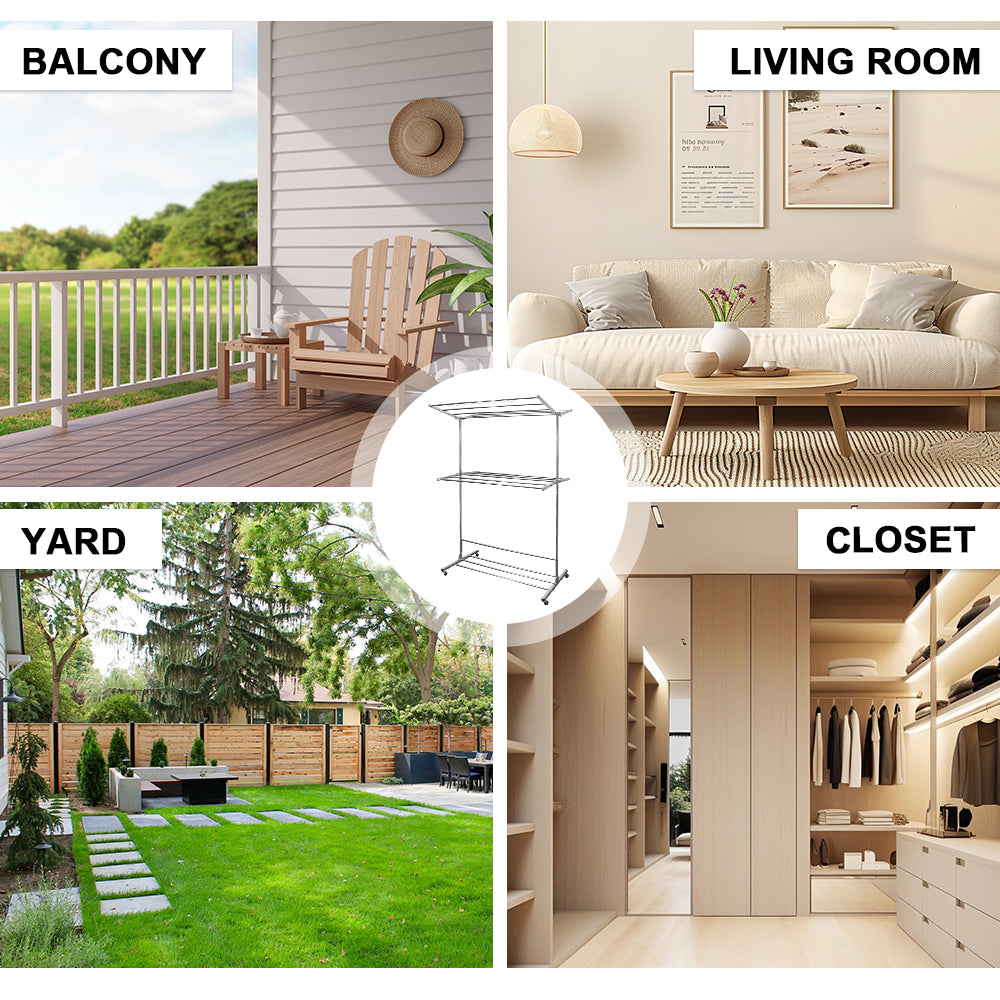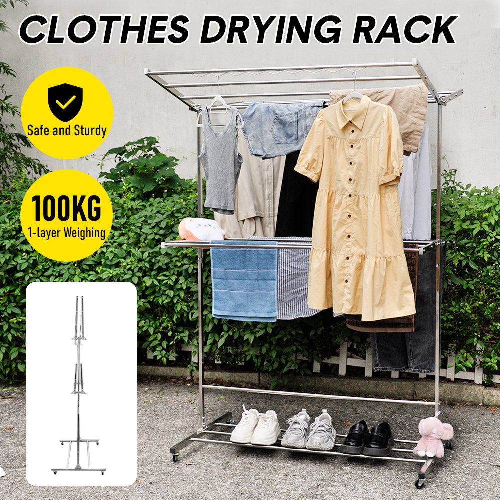 Crafted from stainless steel, the drying rack resists rust and corrosion. It offers ample space for clothes, towels, and even shoes. and avoid wobbling under heavy loads. Its four wheels make it easy to move, with each wheel equipped with a lock for stability. Simple to assemble with included instructions and tools.