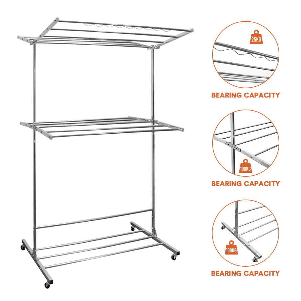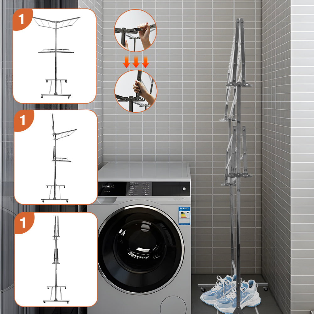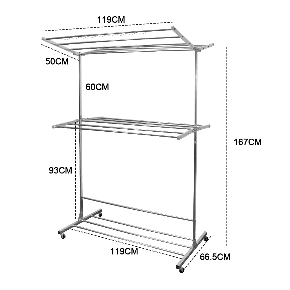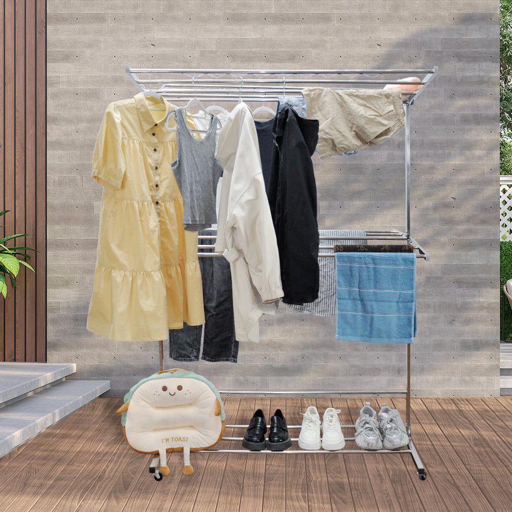 Crafted from stainless steel, the drying rack resists rust and corrosion. It offers ample space for clothes, towels, and even shoes. and avoid wobbling under heavy loads. Its four wheels make it easy to move, with each wheel equipped with a lock for stability. Simple to assemble with included instructions and tools.