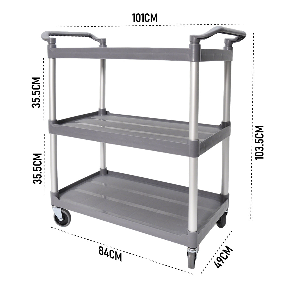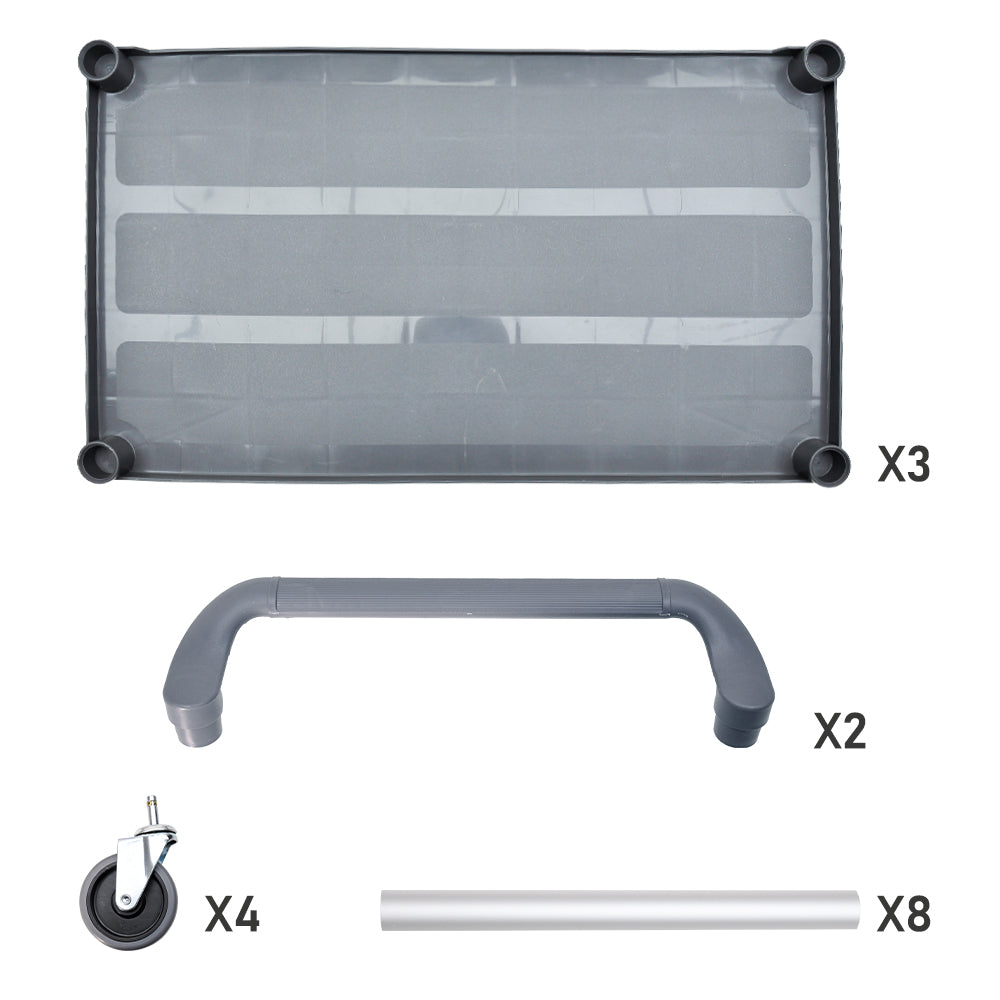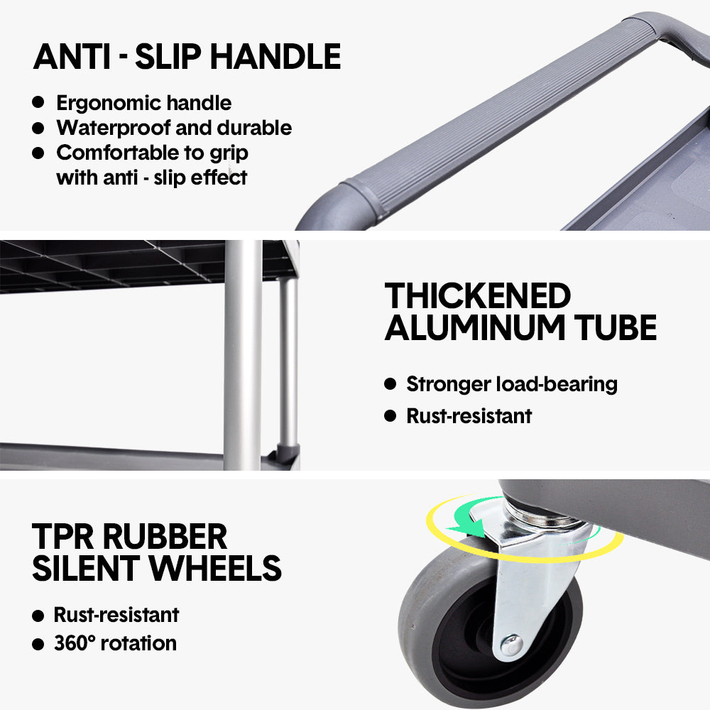 The cart features three spacious tiers with reinforced plastic shelves. Sturdy aluminium poles provide overall enhanced stability, making it reliable for everyday use. Four 4-inch caster wheels allows for effortless mobility even in heavy load while non-slip handles provide a secure grip. Easy to assemble and simple to clean.