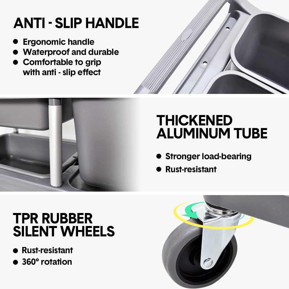Built with thickened plastic and aluminium alloy poles, the cart ensures durability and stability even with heavy loads. It includes three large trays, two buckets, one small tray, and built-in hooks for organized storage. Silent swivel caster wheels provide smooth, quiet mobility, while frosted anti-slip handles offer secure pushing or pulling.