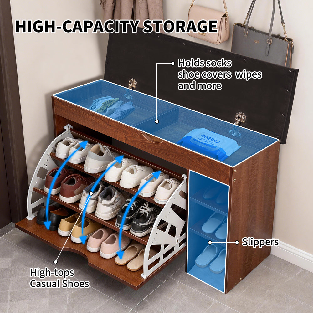 With generous 3-tier storage, this shoe cabinet keeps everyday shoes neatly organized while maintaining a tidy entryway and providing a comfortable seat for changing shoes. Its flip-top hidden compartment beneath the cushion offers more storage for socks, keys, or other daily essentials. Every section helps you keep items sorted. Ideal for families, apartments, hallways, and entryways.
