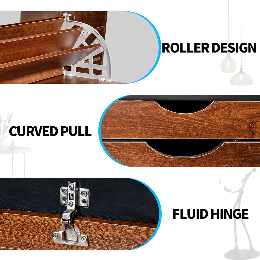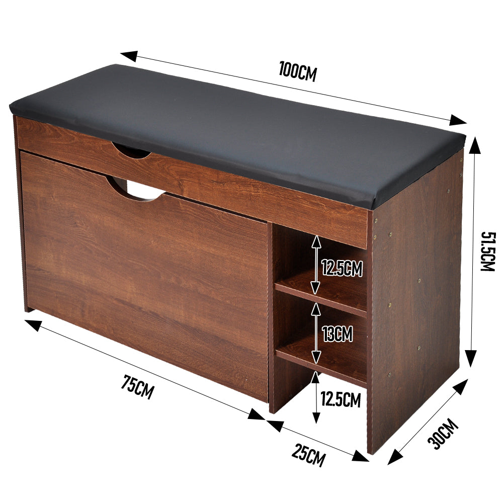 Crafted from high quality wood with a solid structure, this bench offers excellent stability. Flip-top hidden drawers, folding shoe rack and open storage space helps you sort your shoes and items. Cushioned seat at an ergonomic height provides comfortable, stable seating. Smooth hinges and curved pull handles ensure quiet, safe daily use.