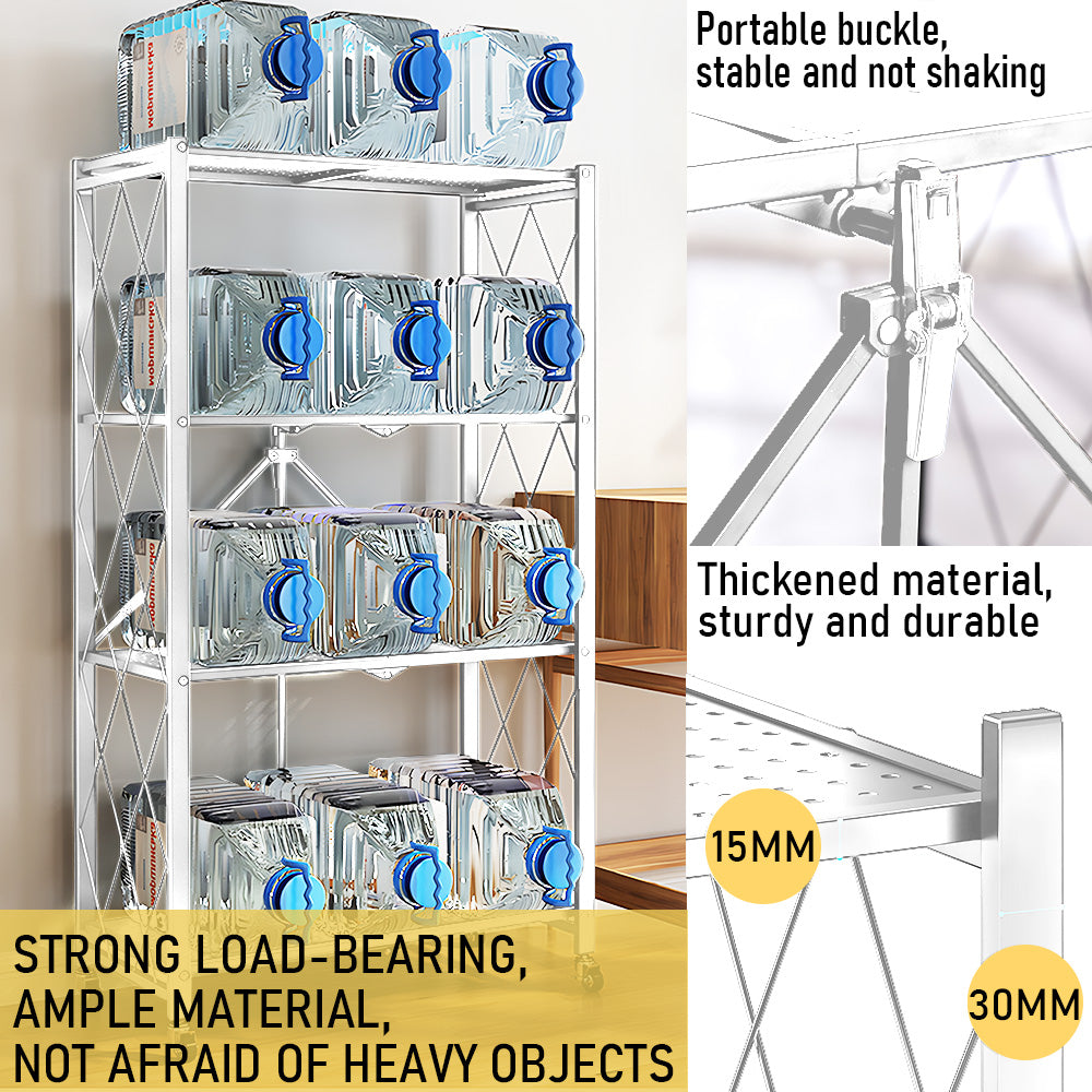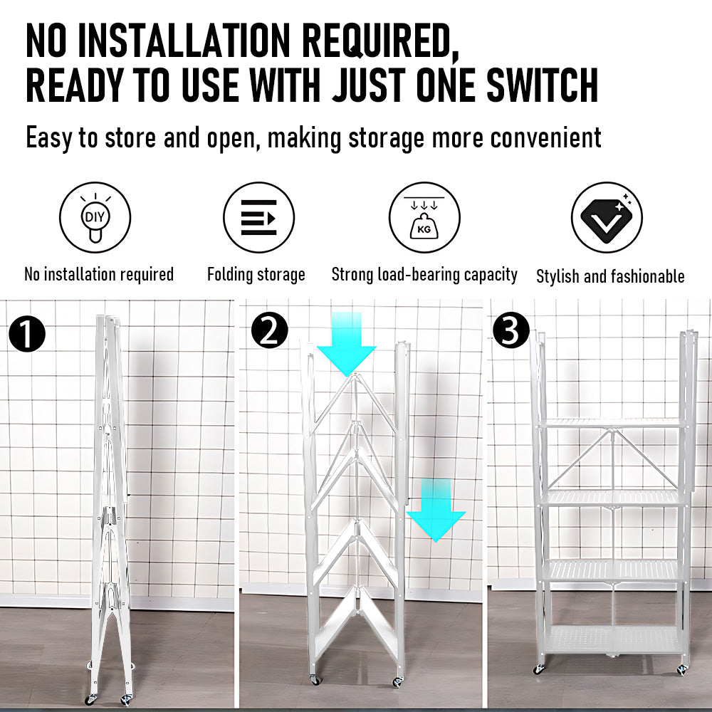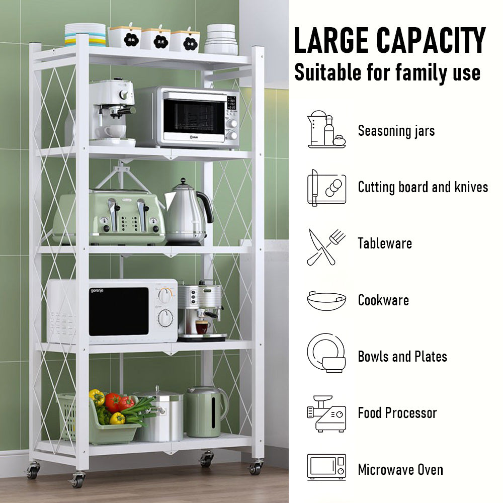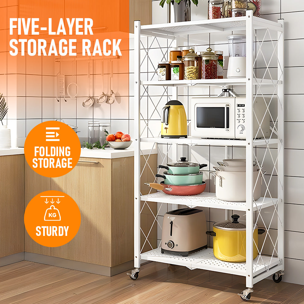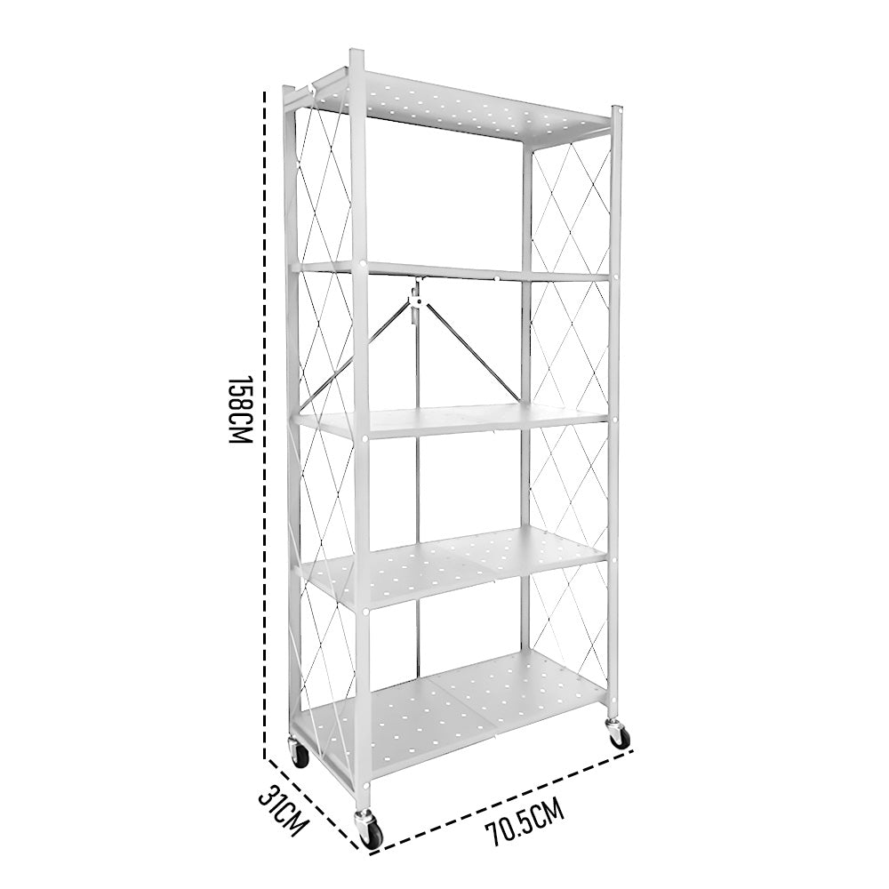 The 5 Tier Storage Shelf Rack offers ample storage space for kitchen essentials, books, or decorative items. Its foldable design allows for effortless setup and storage, making it convenient for both use and transport.