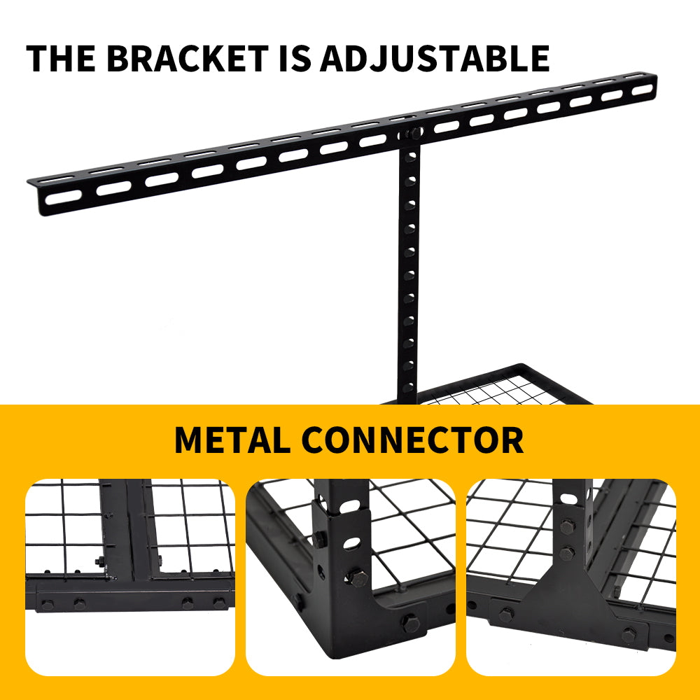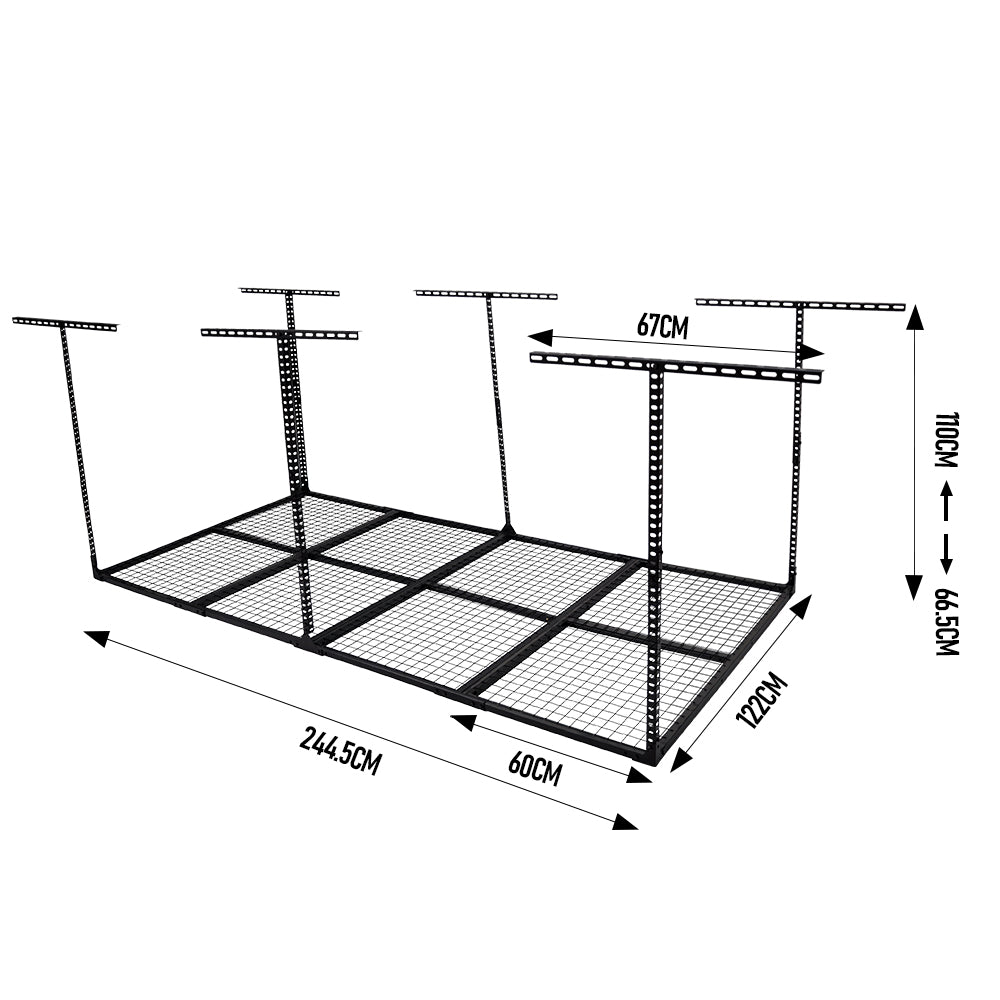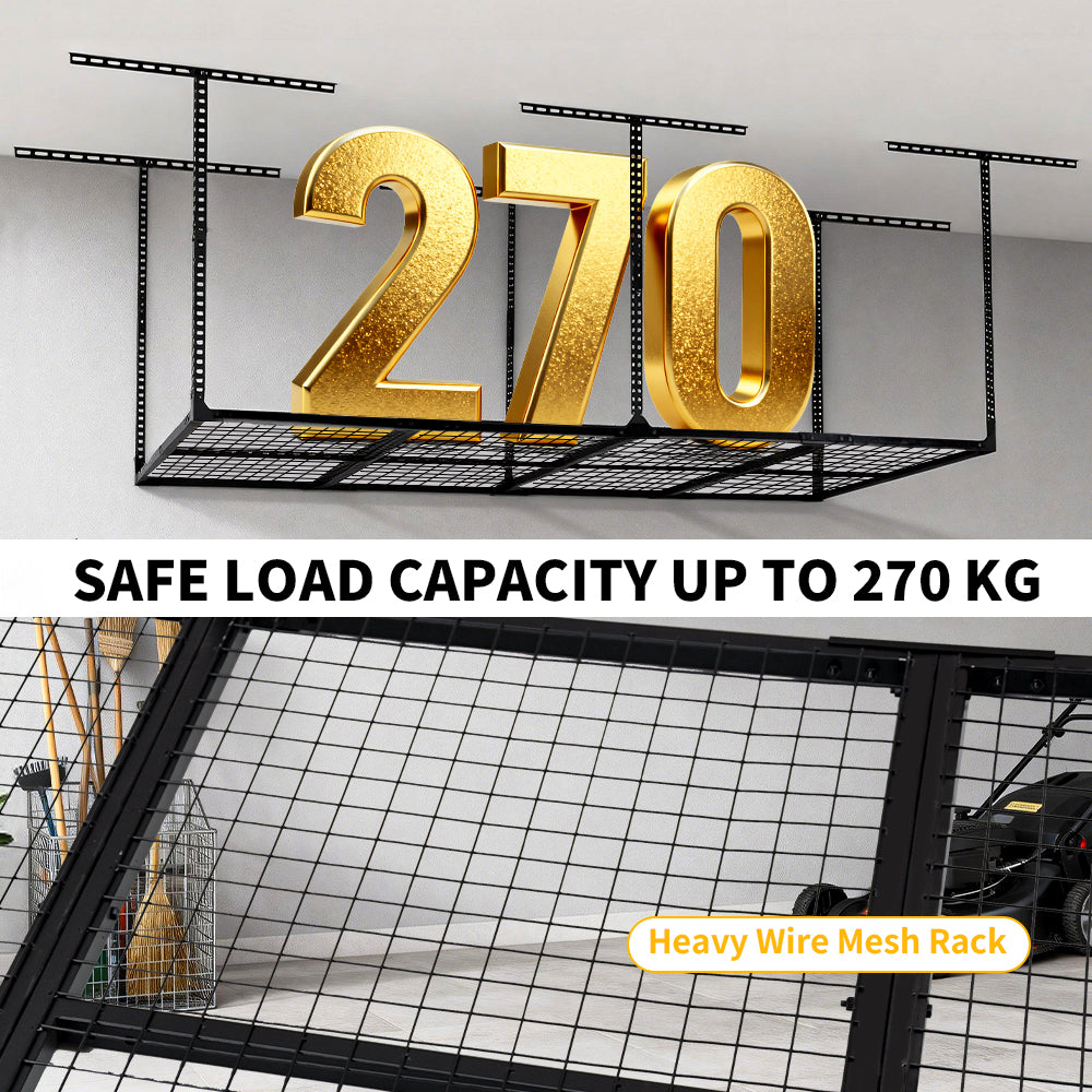 Our 4x8ft ceiling-mounted storage rack transforms unused overhead space into an organized storage area for garages, warehouses, and workshops. Supporting up to 270kg, it easily accommodate heavy equipment, seasonal gear, and unused items. Its practical design not only enhances the aesthetic of your garage but also optimizes your storage.