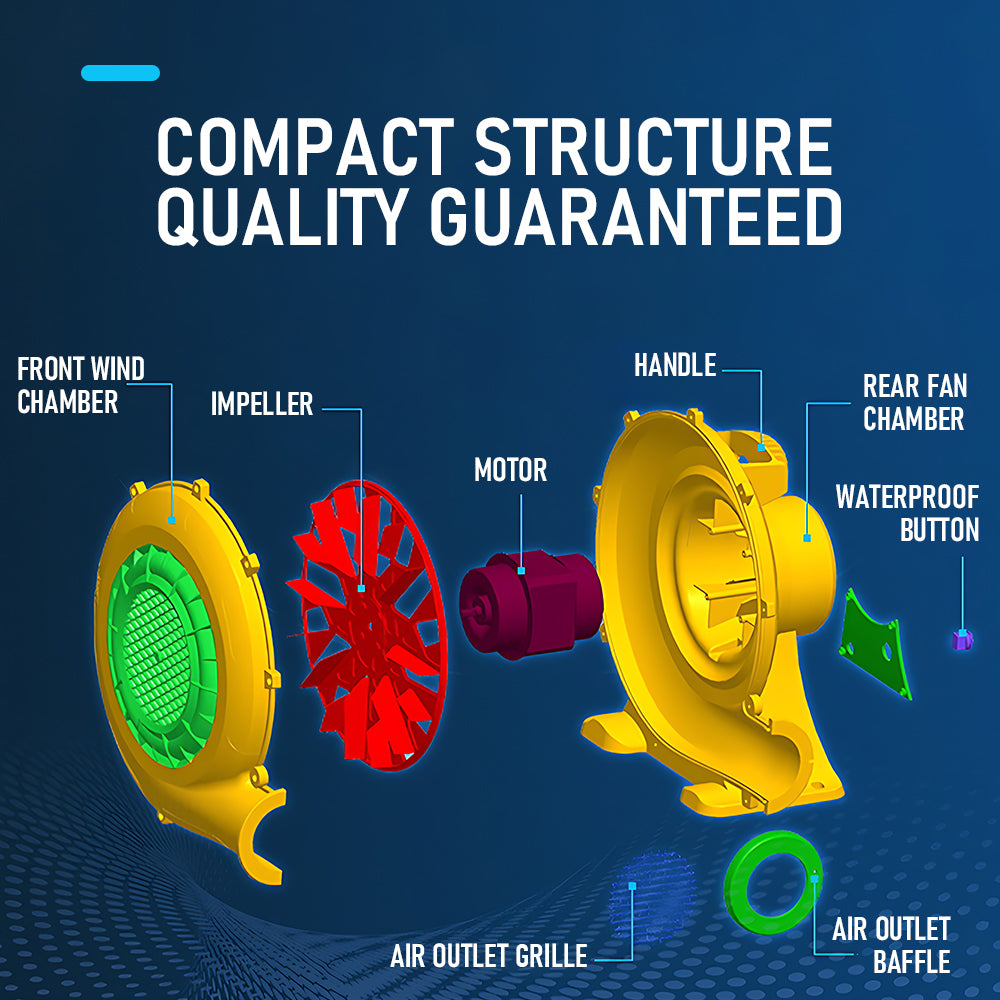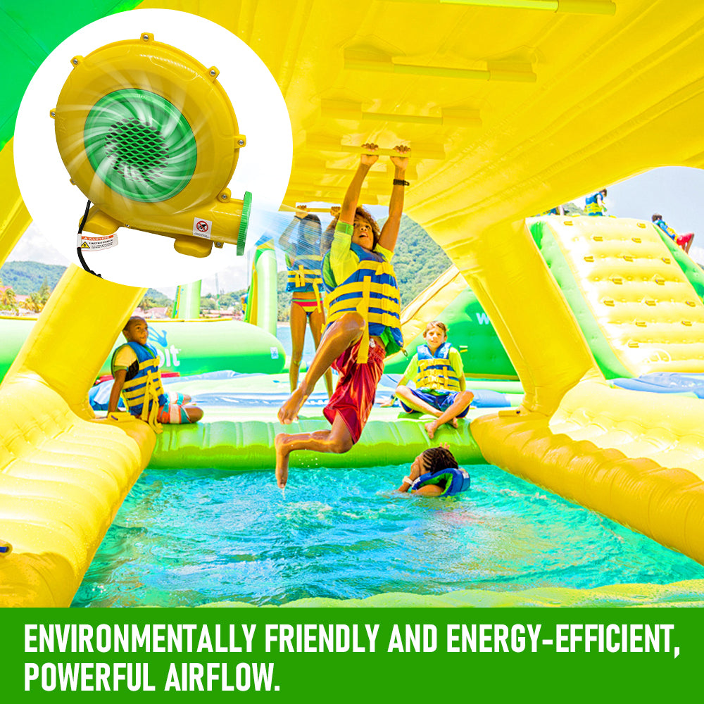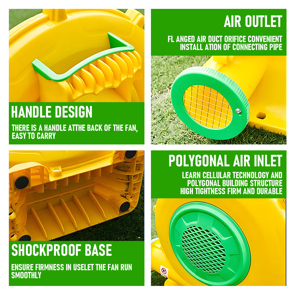 This robust 680W Air Blower is meticulously crafted for quick and easy inflation of medium to large bounce houses. With a efficient power rating of 680 watts, this blower also serves various construction needs like drying wet carpets, sidewalk cleaning, or leaf clearance in the yard!