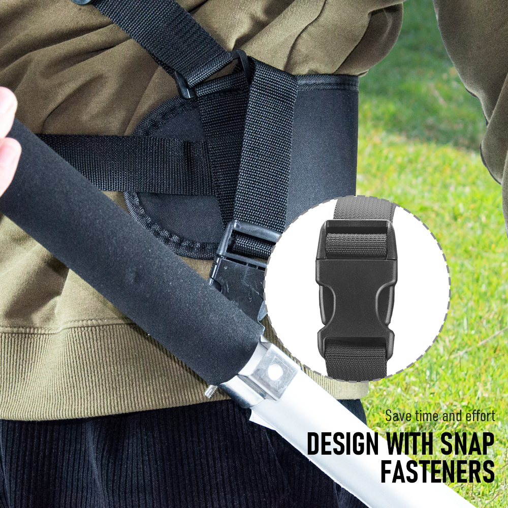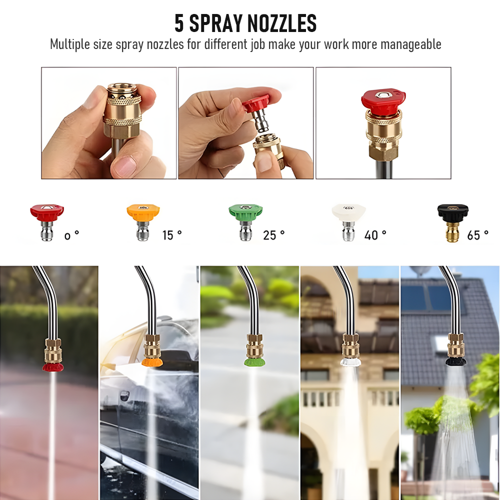 The 6m Telescoping Pressure Washer Wand, with a max pressure of 4000 PSI and 9 GPM flow, extends from 5 to 20 ft. It features a lockable trigger, 5 size spray nozzles (0°, 15°, 25°, 40°, and 60°), a 15° extension wand, and adjustable support belt for comfort and compatibility with a wide range of pressure washers.