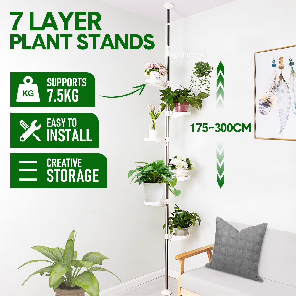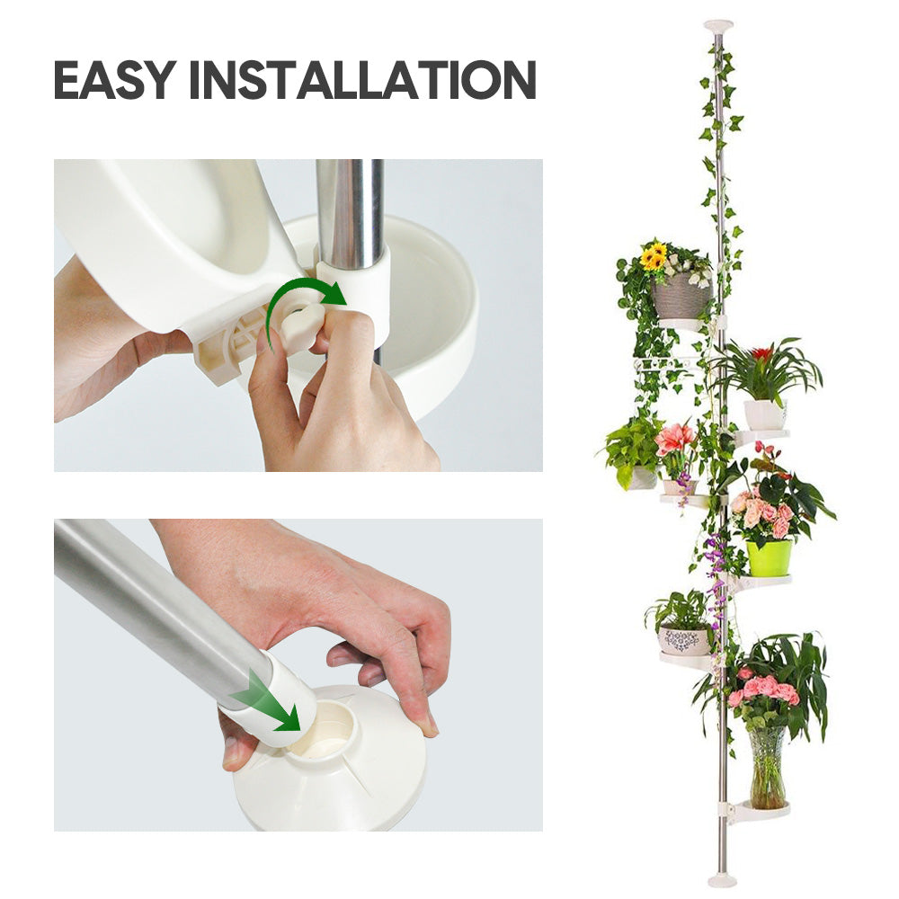 Introducing our 7-tiered plant stand, crafted from high-quality stainless steel and ABS plastic, each tray supports up to 7.5 kg. Adjustable height with 360-degree rotation allows plants of different heights to stand out. Easy no-drill installation maximizes corner space, keeping your home tidy and organized.