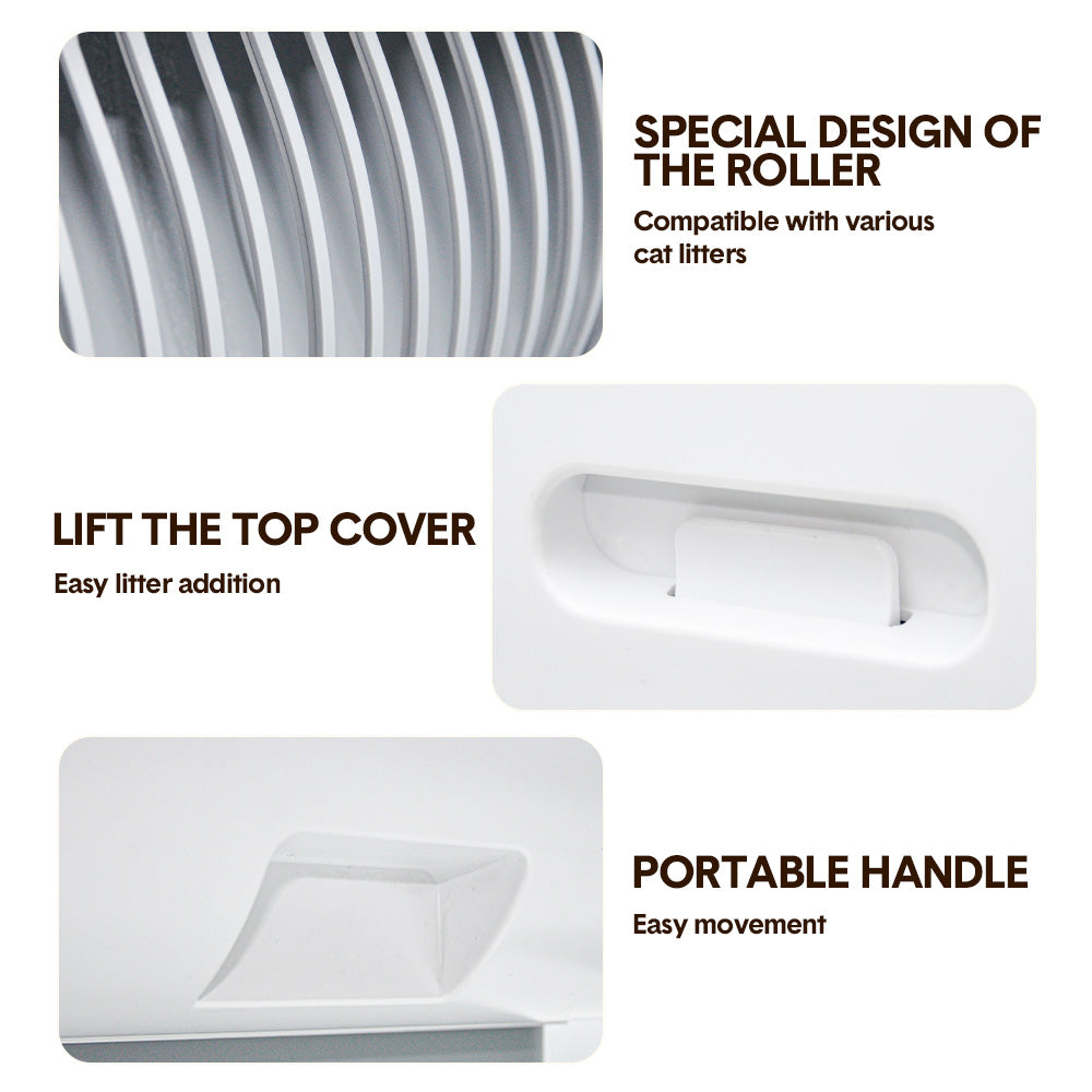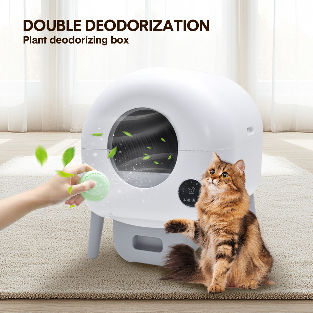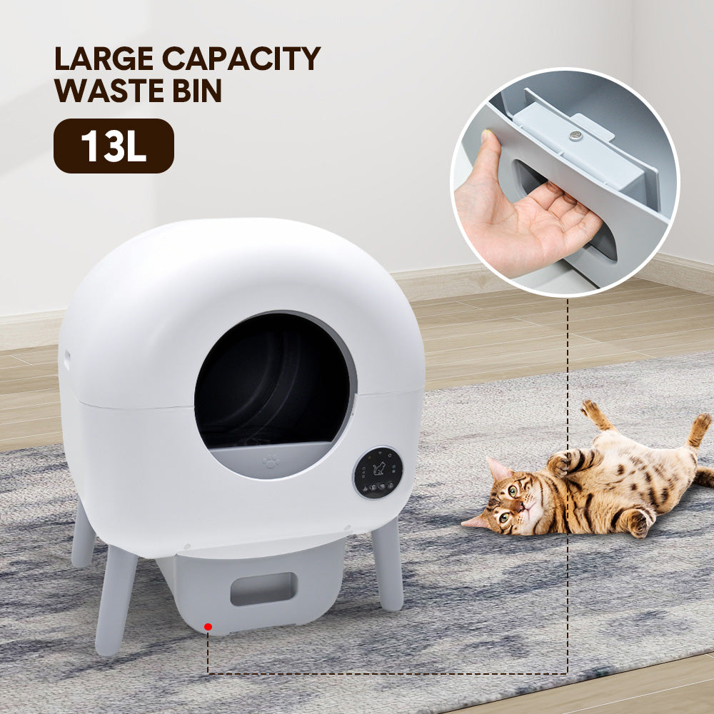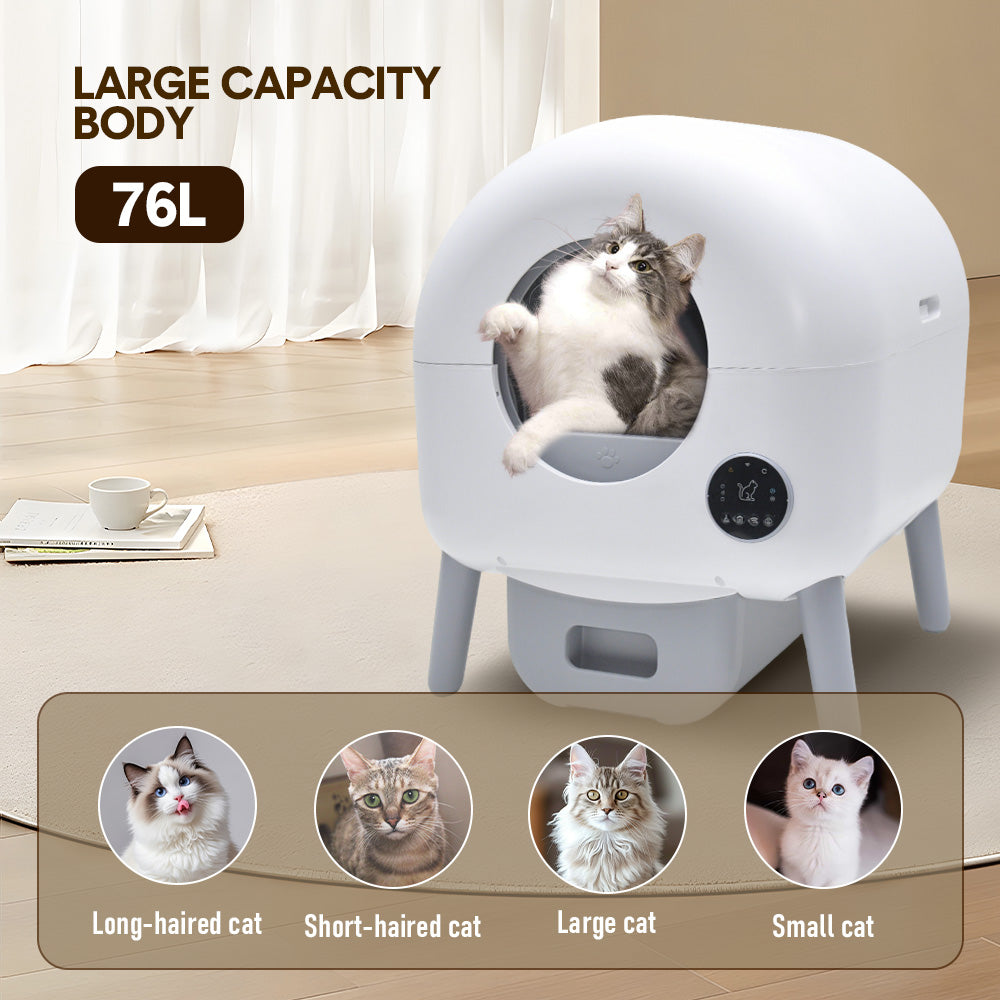 This litter box features extra-large 76L capacity with 13L waste bin, app-controlled convenience, and a user-friendly LED panel. It enhances safety with gravity detection and an infrared sensor for automatic stop when the cat enters. And it is compatible with all types of clumping cat litter and anti-stick mat for easy cleaning.