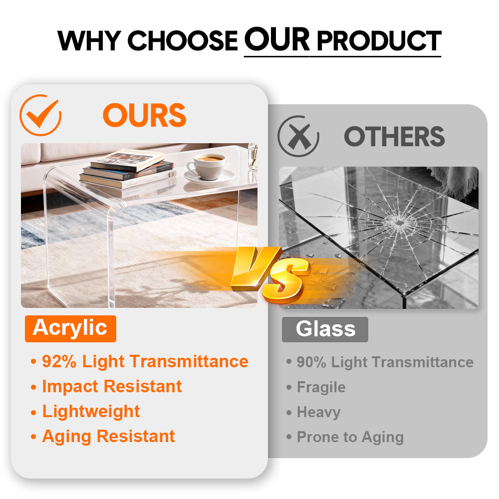 Built with thick acrylic, this table stays strong, stable, and safe for everyday use. The smooth rounded edges protect against bumps, while the lightweight one-piece design makes it easy to move and clean. This coffee table requires no assembly. It handles daily life with ease and keeps your space stylish and modern.