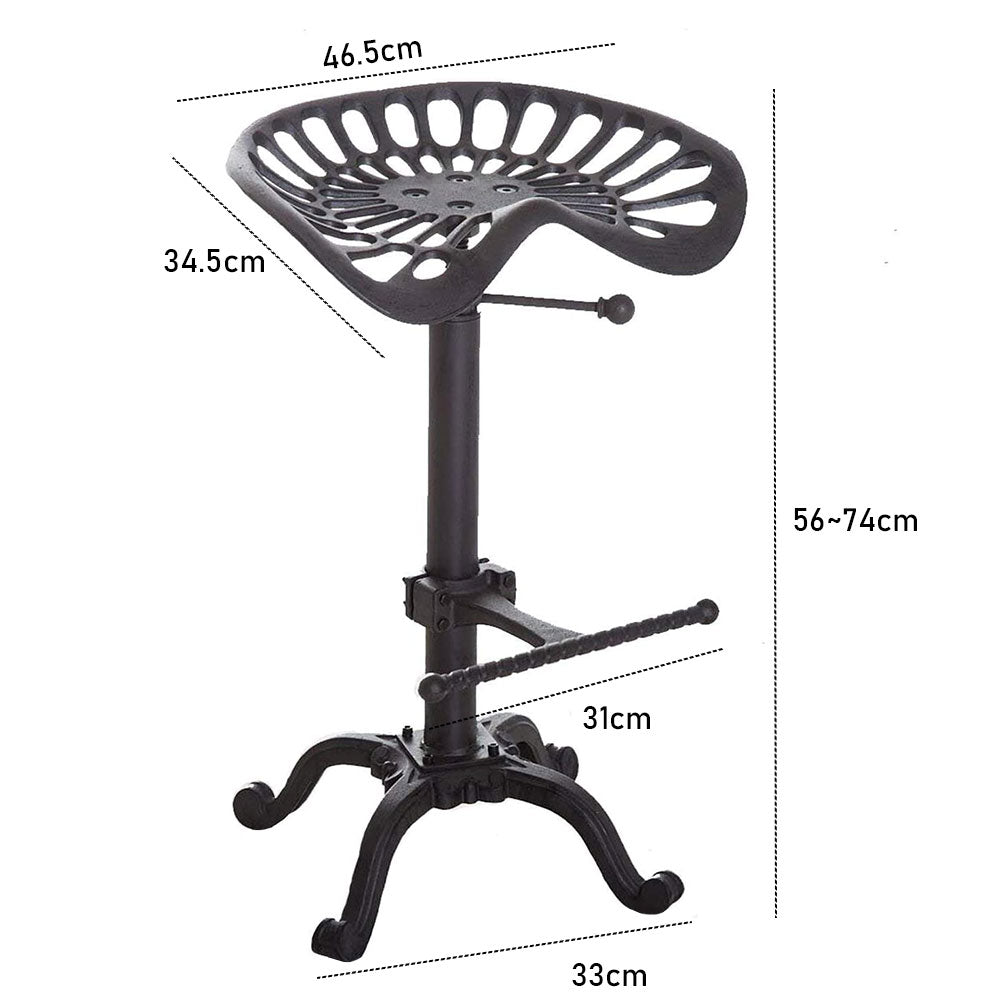 The rustic industrial-style cast iron bar stool features a protective powder-coated finish, adjustable height (56cm to 74cm), and a swivel seat.. An upgraded larger diameter threaded shaft ensures enhanced security and durability.