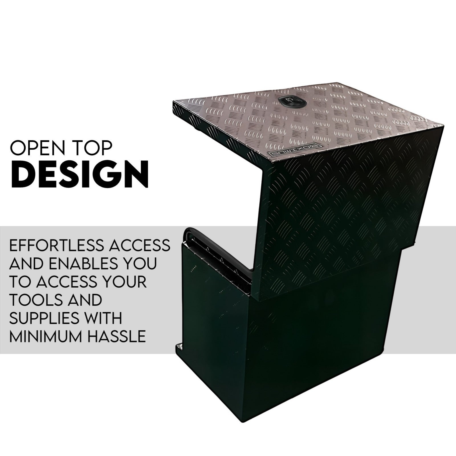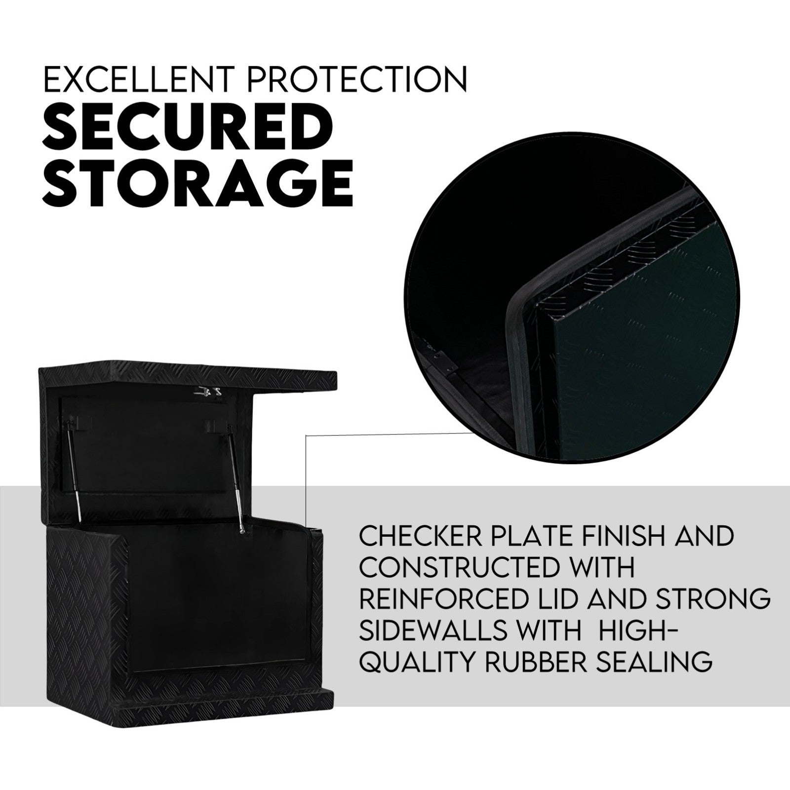 This tool box has a checker plate finish and constructed with reinforced lid and strong sidewalls. The high-quality rubber sealing and fully welded seams also helps to keep your precious equipment and tools clean and dry from the weather elements. Better still, the open-top design enables you to access your tools and supplies with minimum hassle.