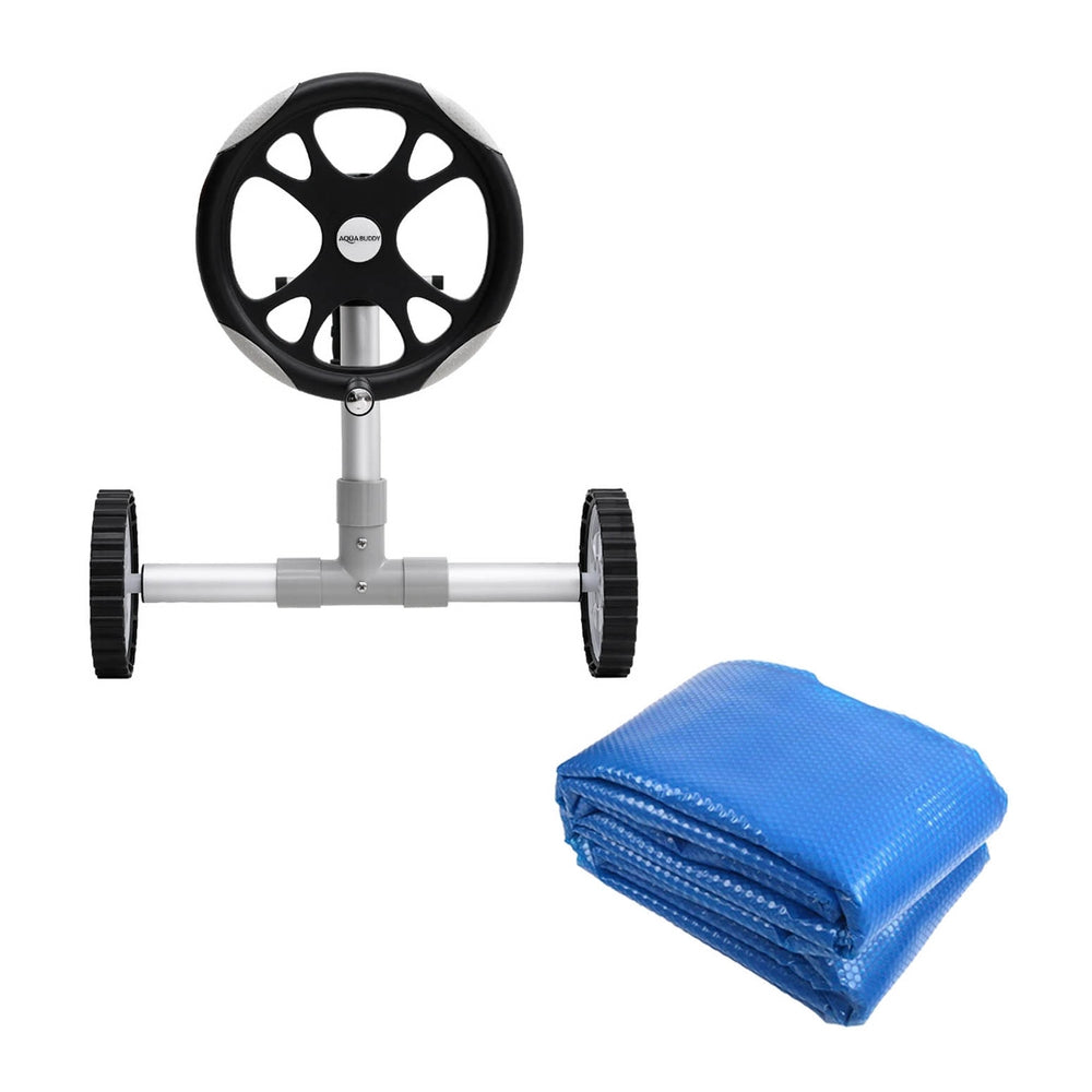 Keep your pool clean from debris and warm from the power of the sun with Aquabuddy's Aluminium Pool Roller and 11m x 6.2m Pool Cover. Made of sturdy aluminium construction with full adjustability, this pool roller is suitable for pools with a width between 3.1m-6.55m. It is equipped with premium anodized aluminium alloy telescopic poles, plastic wheels for maximum portability, and a low friction crank wheel to easily roll up your pool cover and get right in the water. The solar pool cover is made from premium low-density 400 micron polyethylene, which makes it extremely durable. The blue top and silver underside allow the sun's rays to penetrate the pool, increasing the temperature and significantly reducing water evaporation. Finally, the cover keeps the pool water clean all year round, reducing the time spent maintaining the water, pumps and filters. Get the best of natural resources and save money on chemicals and water; get yourself an Aquabuddy Pool Roller and Cover set today!