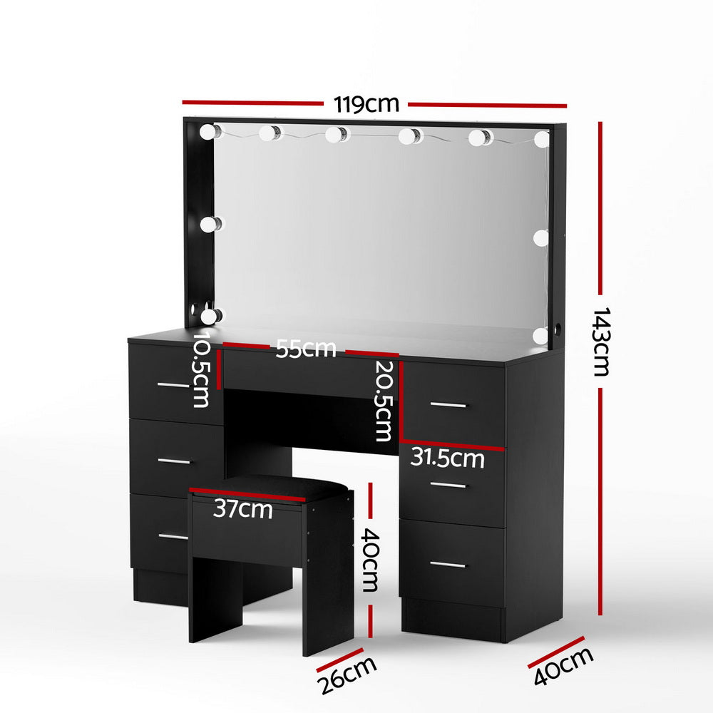 Elevate your beauty routine with the Artiss LED Vanity Desk. Featuring a Hollywood-style makeup mirror with 10 LED bulbs, this vanity offers adjustable 3 colour light modes and 10 brightness levels for precise application. The spacious tabletop accommodates all your essentials, while 7 smooth-runner drawers provide organised storage. Paired with a comfortable foam-padded stool, this durable and easy-to-maintain vanity is the perfect addition to your bedroom or dressing room. Stylish, functional, and thoughtfully designed, it's ideal for beauty enthusiasts seeking luxury and convenience.