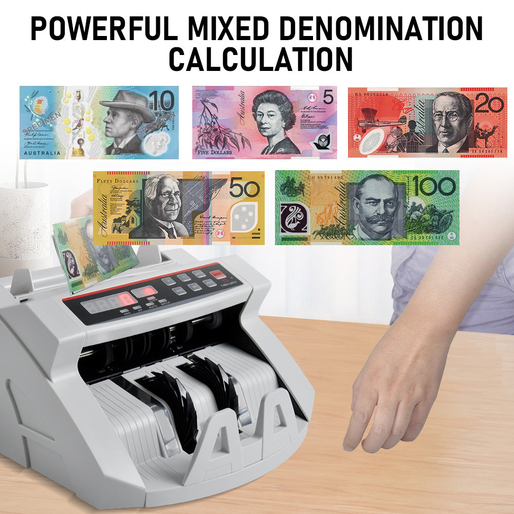 with UV counterfeit detection,our automatic money counter is specially designed for Australian currency, both old and new notes. With a high-speed counting capability of over 900 notes per minute, it ensures accuracy and efficiency. The machine supports automatic start, stop, batching, adding, and clearing.