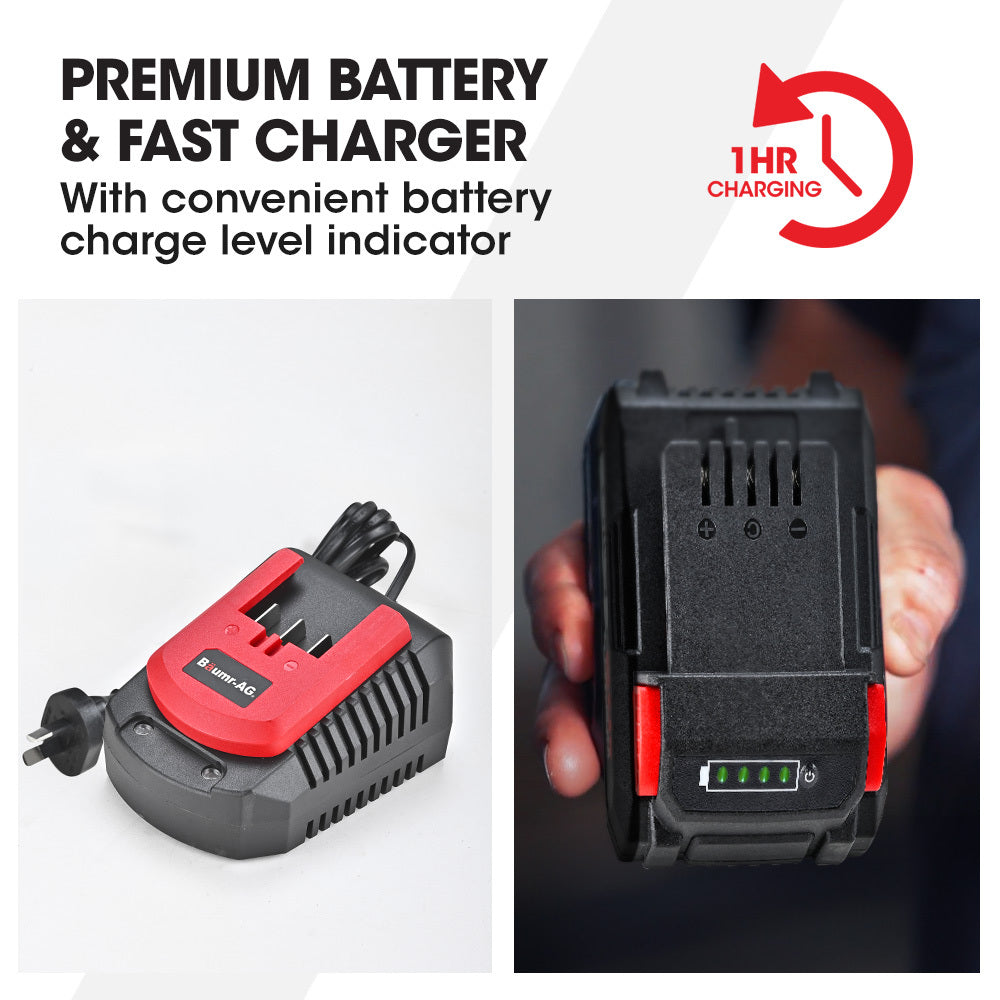 For ultimate convenience, the Baumr-AG 20V SYNC batteries are compatible with the wide range of Baumr-AG cordless electric garden and workshop power tools.