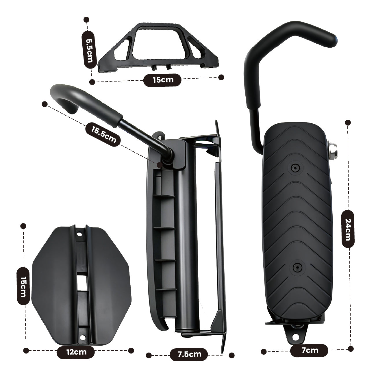 Crafted from durable iron with a protective rubber coating, the rack offers excellent strength and scratch resistance. The swivel mount rotates left, right, or centre by pulling the ring, while a quick button press adjusts the hook to fit different wheel sizes. The package comes with everything you need for quick installation.