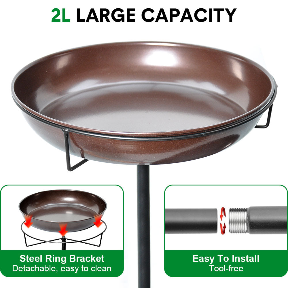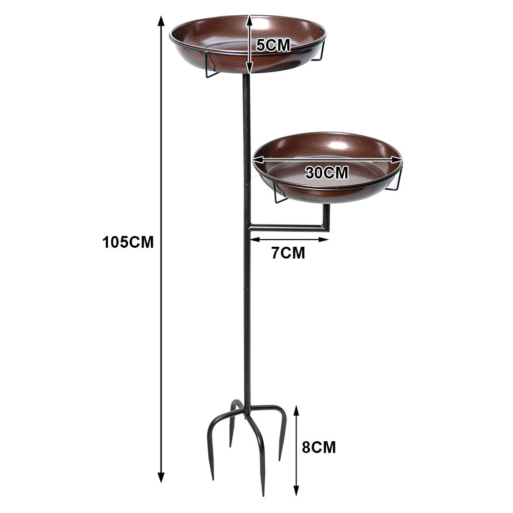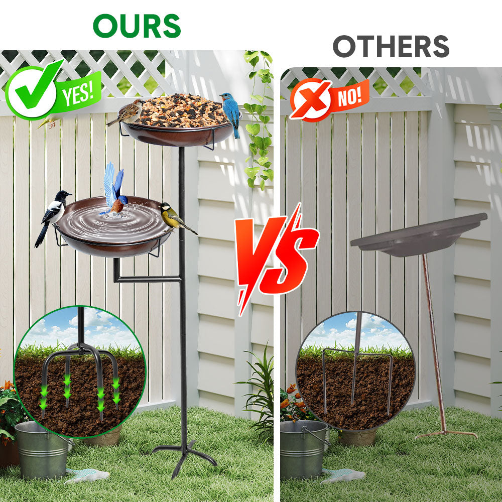 Crafted from premium iron with a protective coating, this bird bath and feeder stand is built to last through every season. The two spacious 12-inch bowls provide ample capacity, while the detachable design make it easy to clean and refill. And stable ground stake keeps the stand secure in the soil even in windy days.
