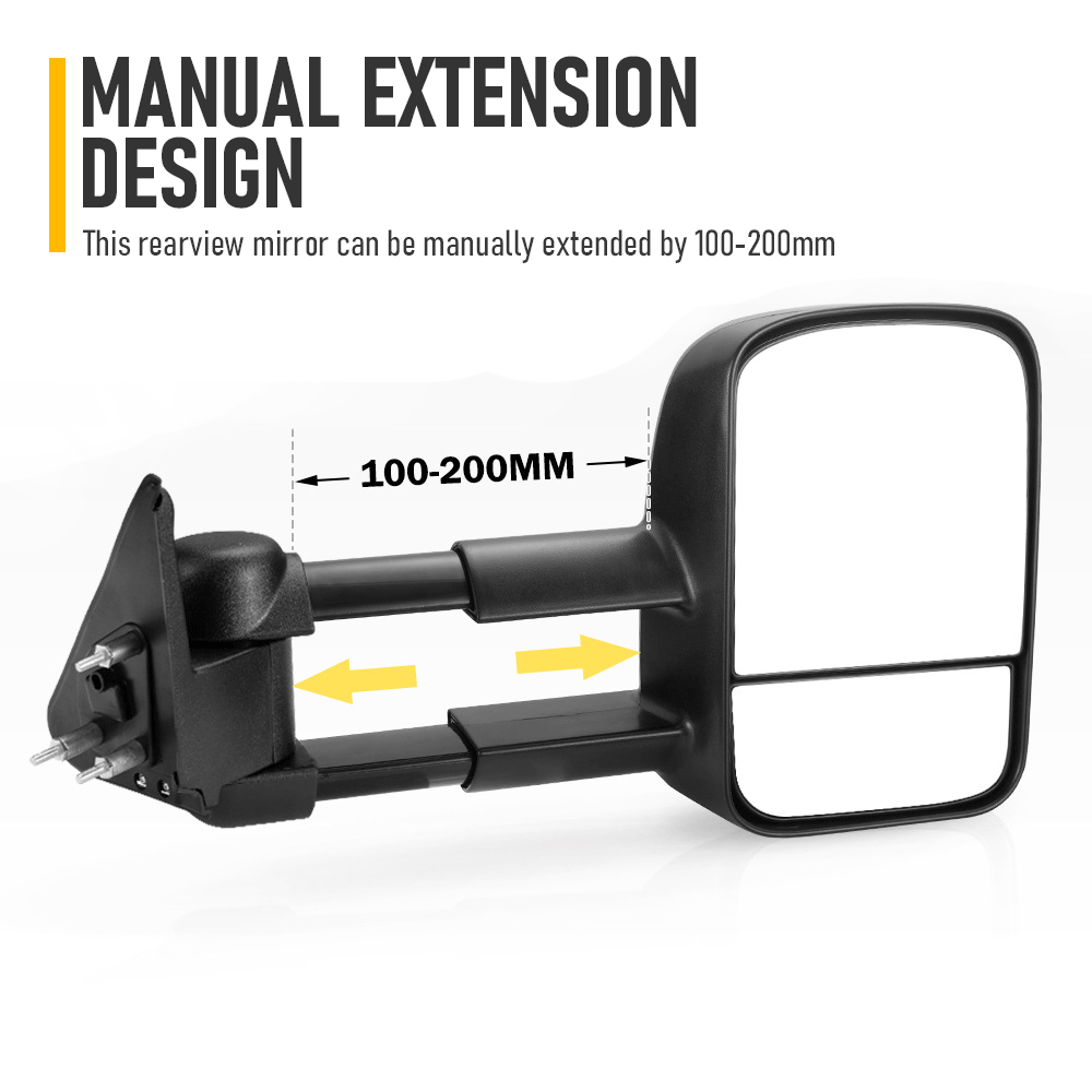 Introducing our Extendable Towing Mirrors, featuring a dual-mirror design within a single casing for Nissan Patrol GU. The foldable mirrors can extend an additional 105mm and a total of 520mm outward from car door.The adjustable convex mirror is to eliminate blind spots and a flat mirror for an unobstructed rear view.