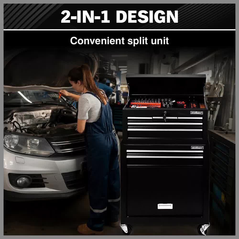 The HORUSDY 7-Drawer Tool Box Chest Cabinet is a versatile storage solution made of durable powder-coated steel. With its 2-in-1 detachable and combinable design, the upper and lower cabinets can be separated or combined as needed, saving space and enabling easy transportation. Each drawer features smooth ball-bearing slides and is lined with non-slip protective liners to keep your tools secure. The tool trolley is equipped with swivel castors, including 3" brake castors for easy maneuverability on slopes. It offers ample storage space, sturdy construction, and premium cam locks with keys for added security.