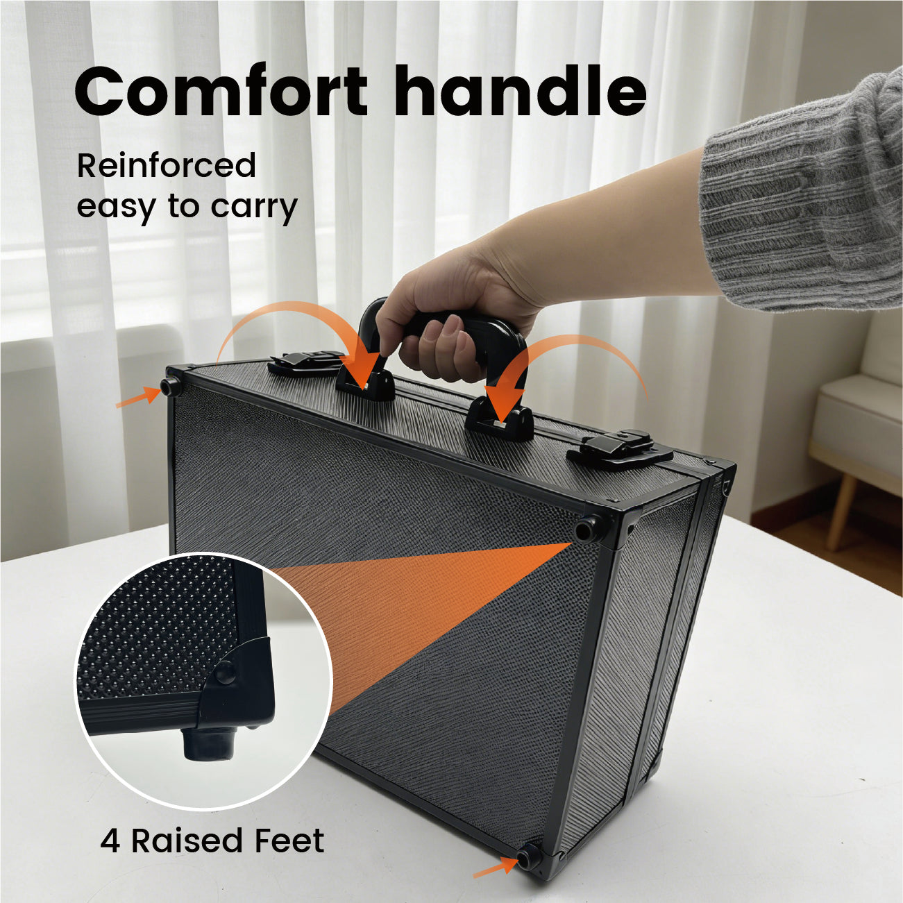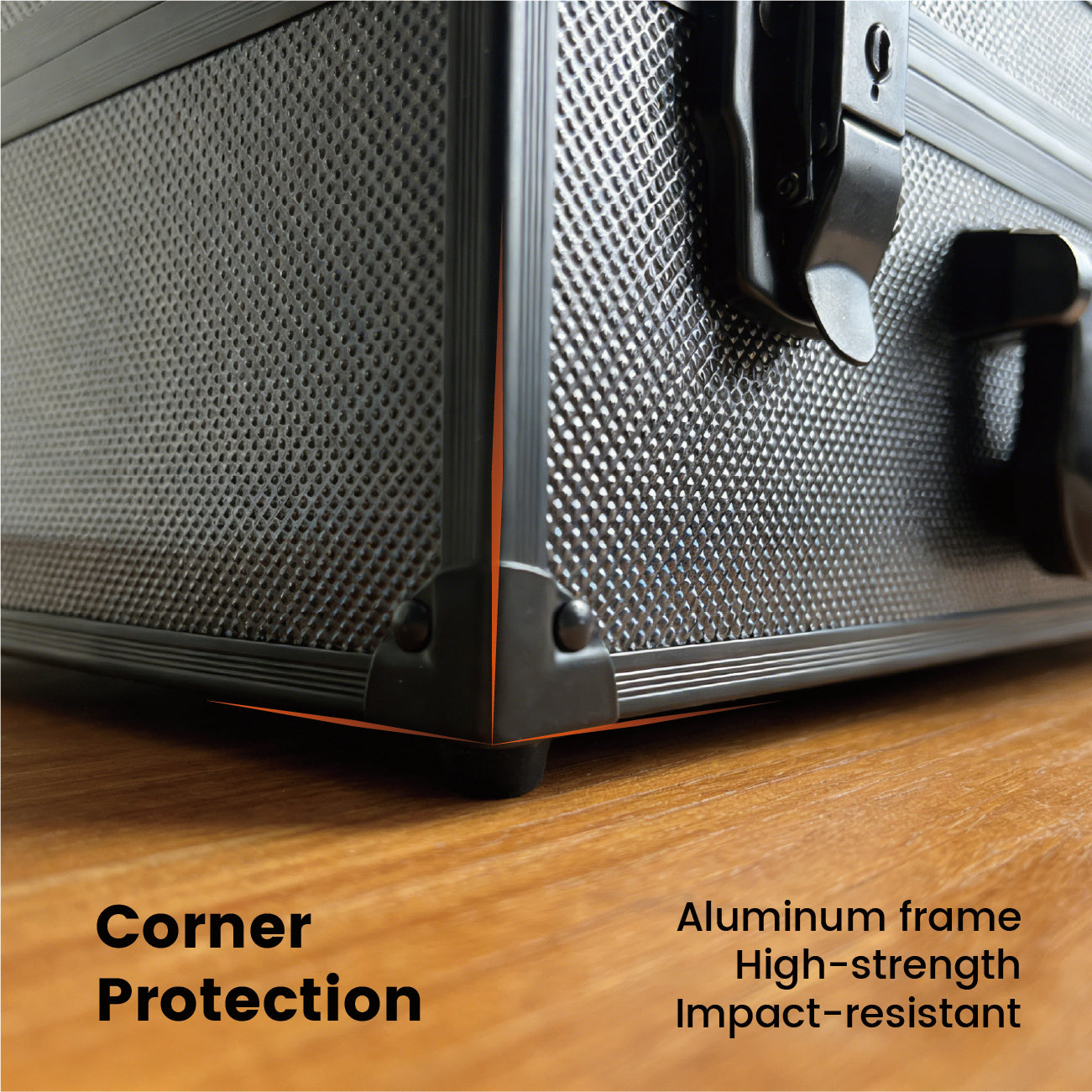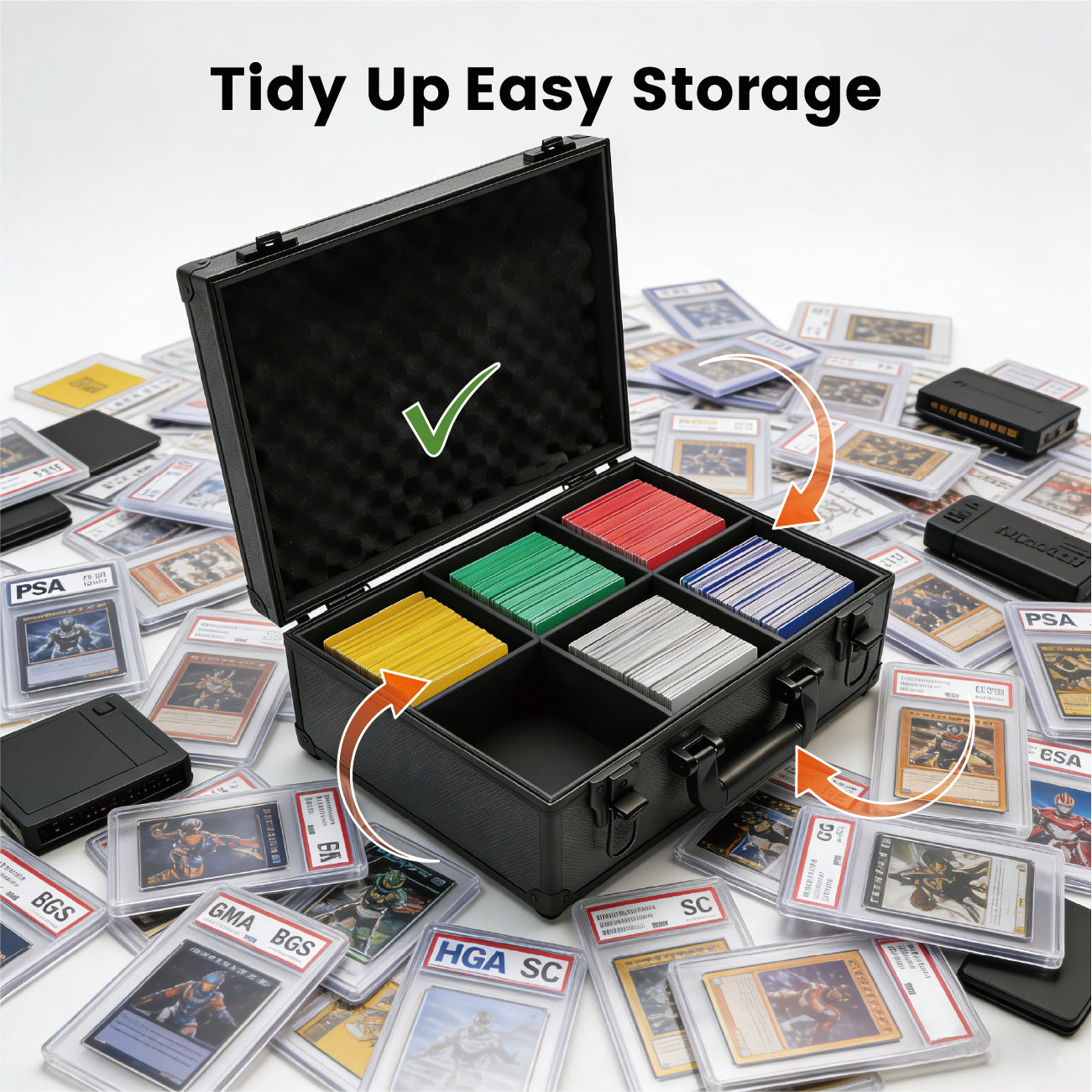 Built with aluminium alloy shell and reinforced panels, this card case delivers reliable durability and long-term protection during storage and transportation. The lid is equipped with a cushioned foam, which provides impact absorption while safeguarding against scratches. Separated compartments facilitate organized and efficient cards retrieval.