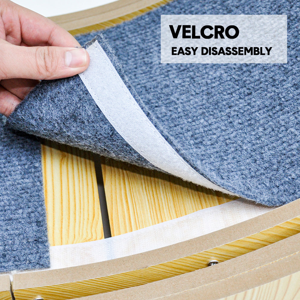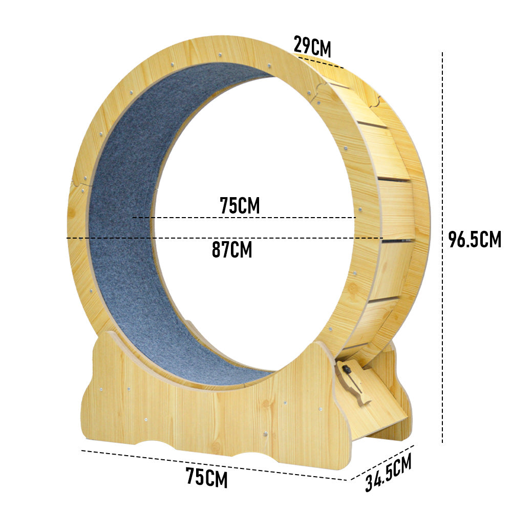 The running wheel consists of a sturdy HDF frame, noise-reducing rollers, and a wide, stable base to support cats of all sizes. Safety latch provides controlled access to the wheel, ensuring your cat exercises only when supervised, and stays safe from accidental overuse or potential injury. Easy to assemble and the detachable, washable carpet makes cleaning simple.