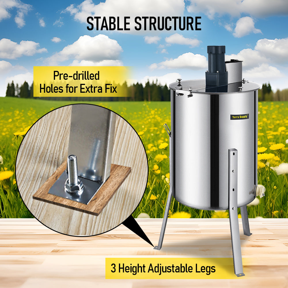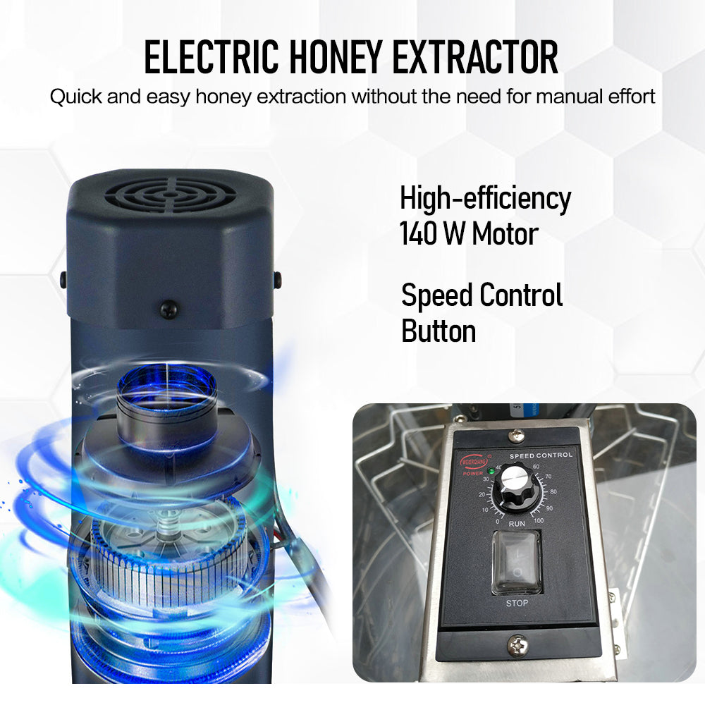 With a powerful 140W motor,this electric stainless steel honey extractor is designed for efficient honey extraction,capable of processing 4 frames.Its stainless-steel construction ensures durability and food-grade safety. Adjustable height,clear perspex lids,and easy assembly make it suitable for beekeepers.