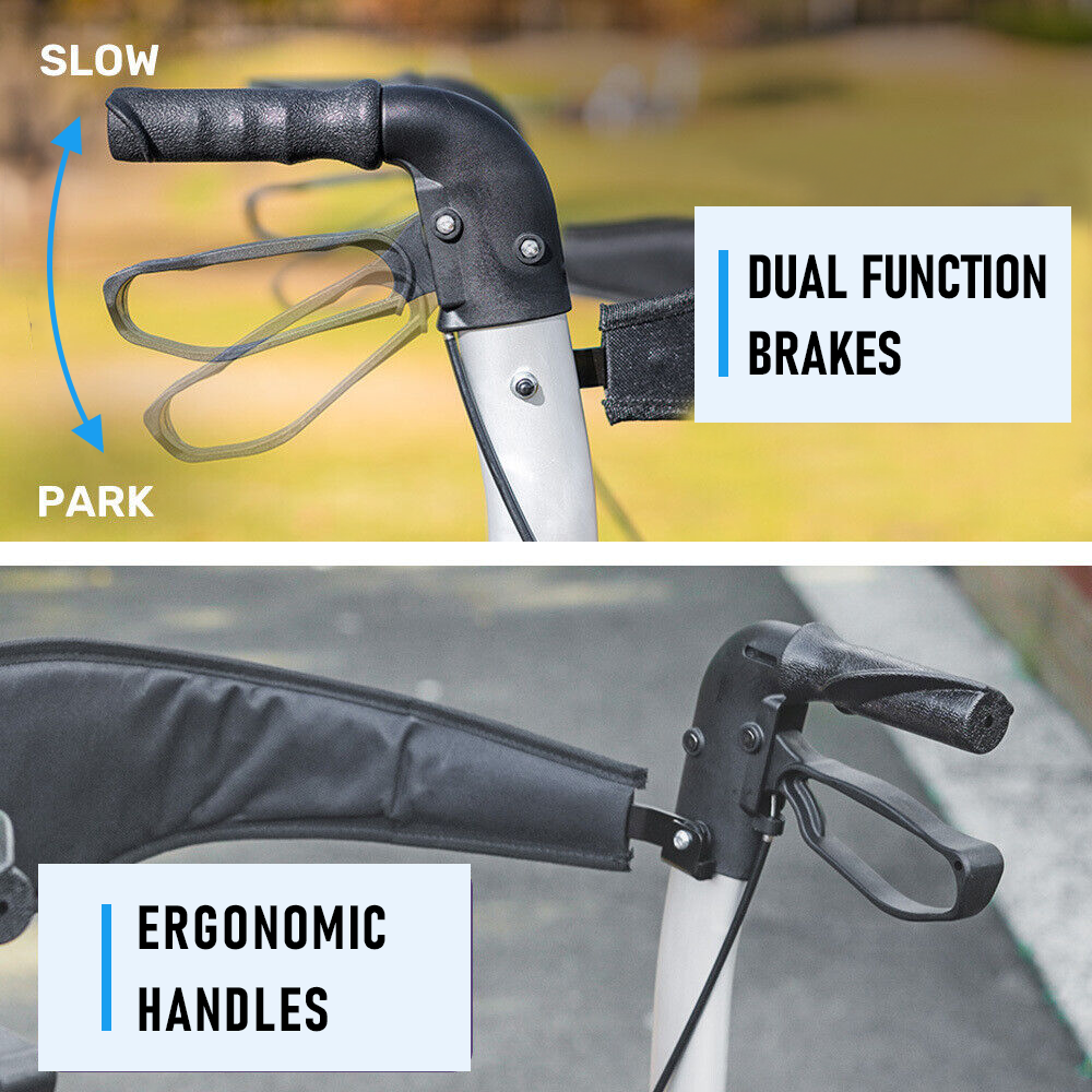The 2-in-1 Mobility Walker offers a convertible mobility aid and seat with a 125kg capacity, 6 height settings, and 8" wheels for most types of surfaces. It features ergonomic handles with loop brakes, a compact fold, and added storage for shopping, making it an ideal support for seniors and those with mobility needs.