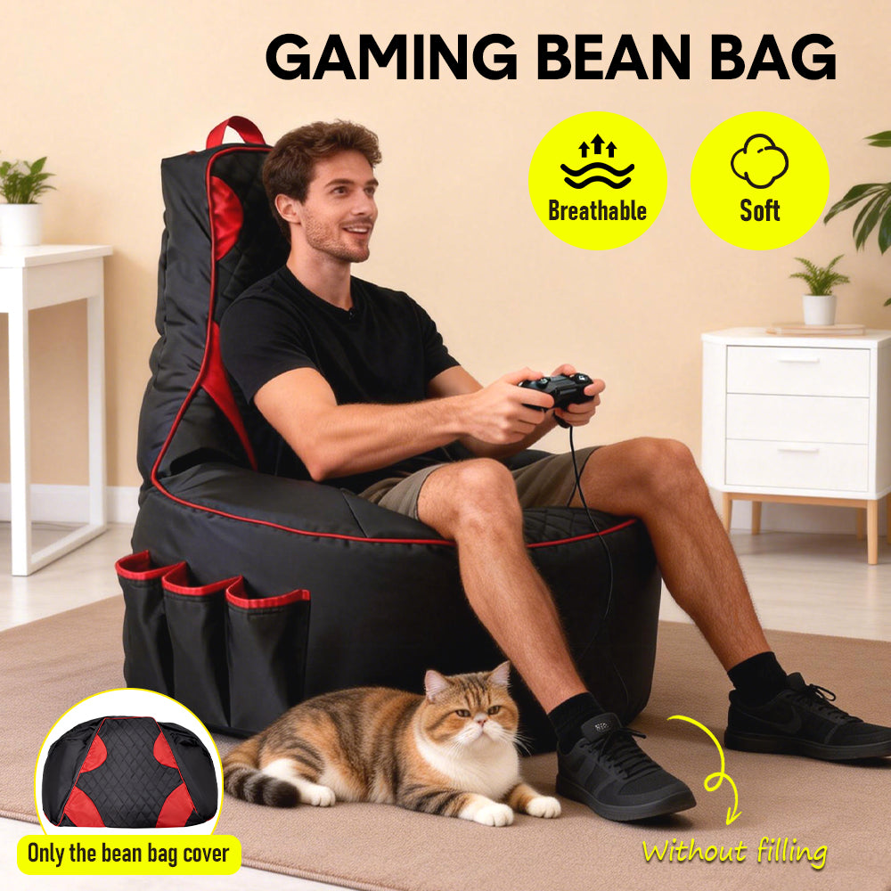 Elevate your gaming experience with our striking black and red gaming bean bag chair cover. Featuring a high back and a generously sized seat, this chair allows you to immerse yourself in your favourite games for hours. It looks right at home in gaming setups, entertainment rooms, or casual lounges. This bean bag chair comes with COVER ONLY; filler is not included.