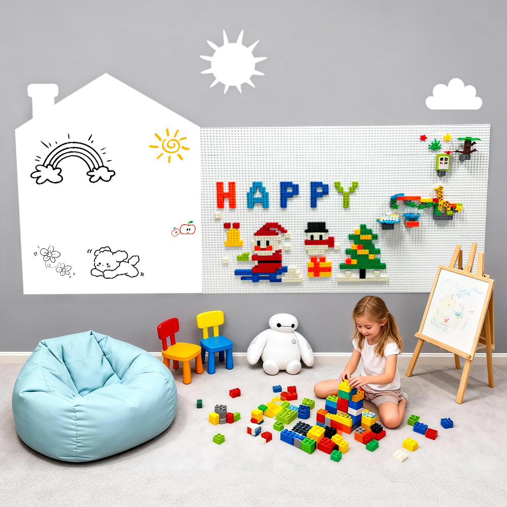 This dual-layer board combines a magnetic whiteboard and a brick base plate in one playful house-shaped design. It transforms any wall into a creative space for kids to imagine, doodle, explore, build challenges, create unique stories, boosts narrative skills and imagination. In addition to being an educational toy, this wall is also a great home decoration.