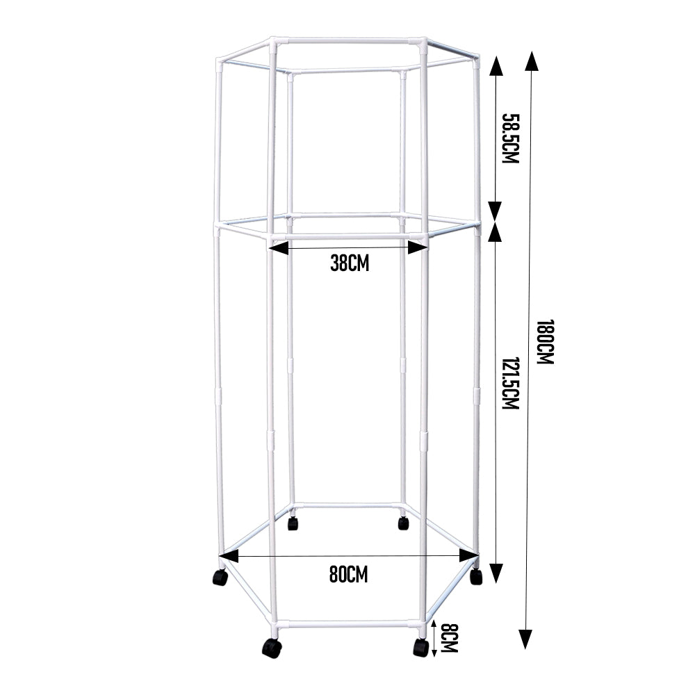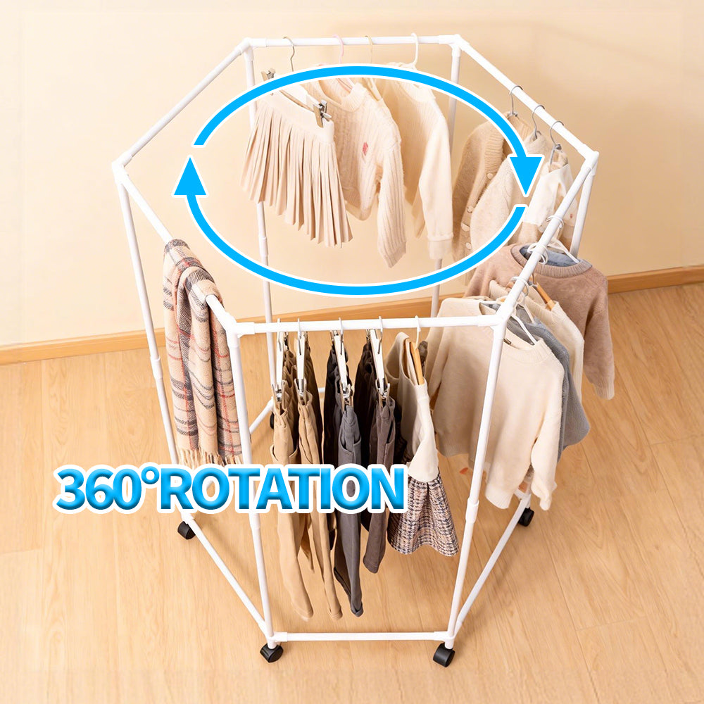 Designed for busy homes and small apartments, this hexagonal rotating clothing rack offers 2-tier ample storage for everything from shirts and jackets to long coats and dresses. It keeps your clothes neat, well-organized, wrinkle-free, and easy to find while saving valuable floor space. Perfect for bedrooms, laundry rooms or using as a drying rack.