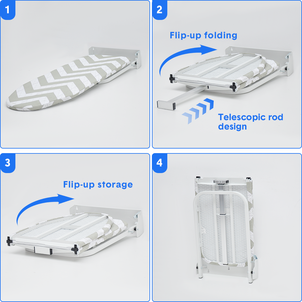 Our Upgraded Wall Mount Ironing Boards offer ultimate convenience with easy wall-mounting, pre-assembled setup, and 90 degree fold and strong support. Folding in half for compact storage, making ironing a breeze.