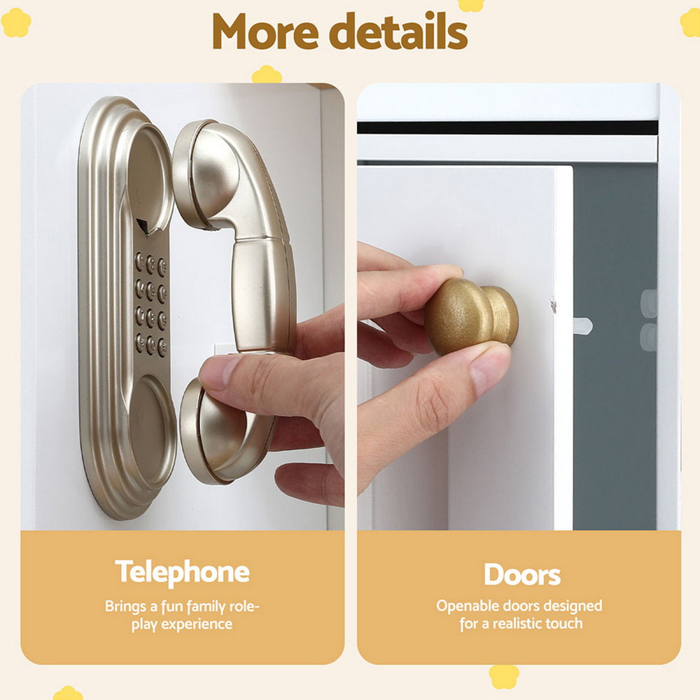 Bring your little chef's imagination to life with this realistic kids' play kitchen set! It offers a realistic cooking experience with multiple functions, detachable sink, cute phone, and water dispenser for interactive fun. Built with sturdy construction and a non-toxic paint finish, it's safe and durable for everyday play. Features ample storage space, easy-to-clean surfaces, and simple assembly for parents' convenience. EN71 certified for toy safety. Recommended for ages 3+, with adult supervision advised.